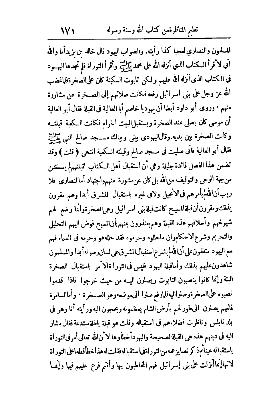 المسلمون والنصارى لعجبا كذا رأيته. والصواب اليهود قال خالد بن يزيد: "أما والله إني لأقرأ الكتاب الذي انزله الله على محمد فلم تجدها اليهود في الكتاب الذي أنزله الله عليهم ولكن تابوت السكينة كان على الصخرة فلما غضب الله عز وجل على بني إسرائيل رفعه فكانت صلاتهم إلى الصخرة عن مشاورة منهم".