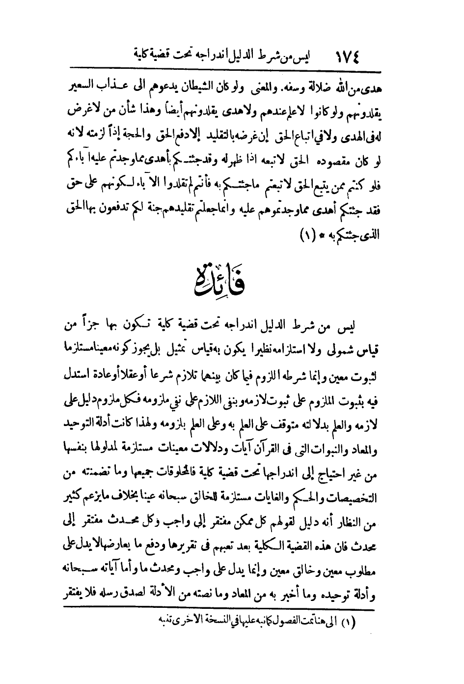 ليس من شرط الدليل اندراجه تحت قضية كلية تكن بها جزءا من قياس شمولي ولا استلزامه نظيرا يكون به قياس تمثيل بل يجوز كونه معينا مستلزما لثبوت معين وإنما شرطه اللزوم فيما كان بينهما تلازم شرعا أو عقلا أو عادة استدل فيه بثبوت الملزوم على ثبوت لازمه وبنفي اللازم على نفي ملزومه فكل ملزوم دليل على لازمه والعلم بدلالته متوقف على العلم به وعلى العلم بلزومه ولهذا كانت أدلة التوحيد والمعاد والنبوات التي في القرآن آيات ودلالات معينات مستلزمة لمدلولها بنفسها من غير احتياج إلى اندراجها تحت قضية كلية فالمخلوقات جميعها وما تضمنته من التخصيصات والحكم والغايات مستلزمة لخالق سبحانه عينا بخلاف ما يزعم كثير من النظار أنه دليل لقولهم كل ممكن مفتقر إلى واجب وكل محدث مفتقر إلى محدث فإن هذه القضية الكلية بعد تعبهم في تقريرها ودفع ما يعأرضها لا يدل على مطلوب معين وخالق معين إنما يدل على واجب ومحدث ما وأما آياته سبحانه وأدلة توحيده وما أخبر به من المعاد وما نصته من الأدلة لصدق رسله فلا يفتقر