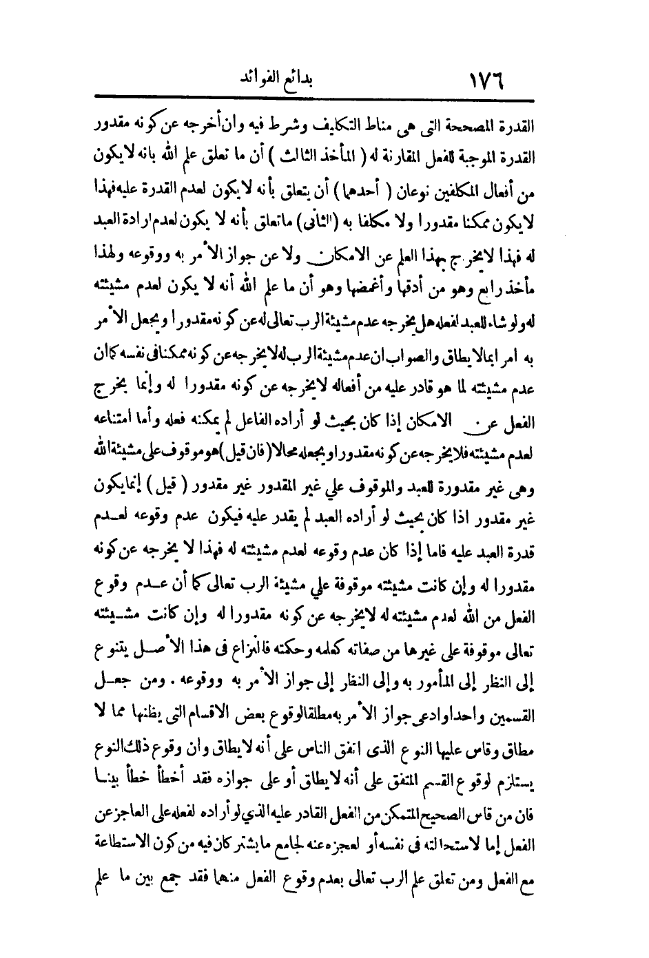 والصواب أن عدم مشيئة الرب له لا يخرجه عن كونه ممكنا في نفسه كما أن عدم مشيئته لما هو قادر عليه من أفعاله لا يخرجه عن كونه مقدورا له وإنما يخرج الفعل عن الإمكان إذا كان بحيث لو أراده الفاعل لم يمكنه فعله وأما امتناعه لعدم مشيئته فلا يخرجه عن كونه مقدورا ويجعله محالا. فإن قيل هو موقوف على مشيئة الله وهي غير مقدورة للعبد والموقوف على غير المقدور غير مقدور قيل إنما يكون غير مقدور إذا كان بحيث لو أراده العبد لم يقدر عليه فيكون عدم وقوعه لعدم قدرة العبد عليه فأما إذا كان عدم وقوعه لعدم مشيئته له فهذا لا يخرجه عن كونه مقدورا له وإن كانت مشيئته موقوفة على مشيئة الرب تعالى كما أن عدم وقوع الفعل من الله لعدم مشيئته له لا يخرجه عن كونه مقدورا له وإن كانت مشيئته تعالى موقوفة على غيرها من صفاته كعلمه وحكمته فالنزاع في هذا الأصل يتنوع إلى النظر إلى المأمور به وإلى النظر إلى جواز الأمر به ووقوعه. ومن جعل القسمين واحدا وادعى جواز الأمر به مطلقا لوقوع بعض الأقسام التي يظنها مما لا يطاق وقاس عليها النوع الذي اتفق الناس على أنه لا يطاق وأن وقوع ذلك النوع يستلزم لوقوع القسم المتفق على أنه لا يطاق أو على جوازه فقد أخطأ خطأ بينا فإن من قاس الصحيح المتمكن من الفعل القادر عليه الذي لو أراده لفعله على العاجز عن الفعل إما لاستحالته في نفسه أو لعجزه عنه لجامع ما يشتركان فيه من كون الاستطاعة مع الفعل ومن تعلق علم الرب تعالى بعدم وقوع الفعل منهما فقد جمع بين ما علم