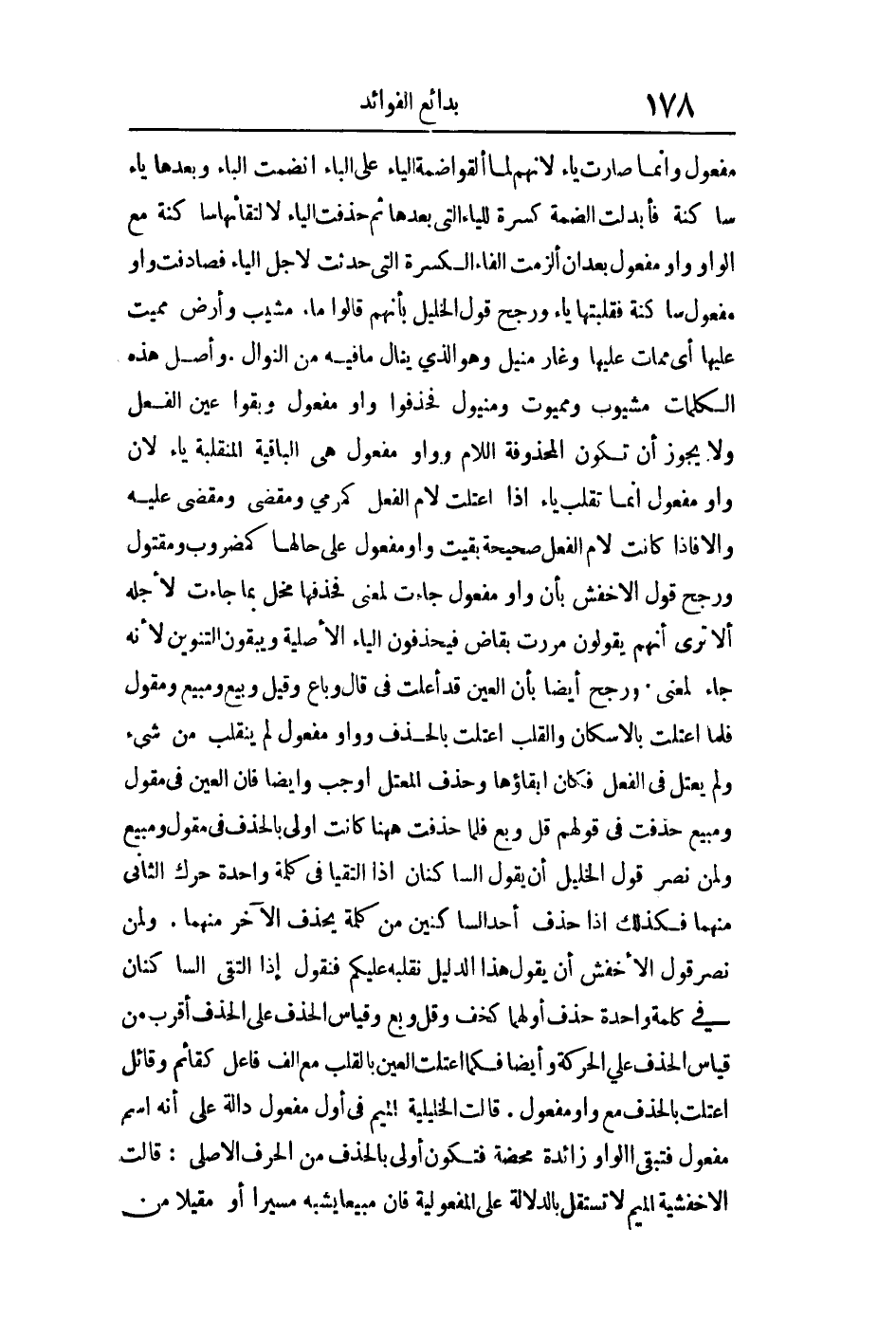 ورجح أيضا بأن العين قد أعلت في قال وباع وقيل وبيع ومبيع ومقول فلما اعتلت بالإسكان والقلب اعتلت بالحذف وواو مفعول لم ينقلب من شيء ولم يعتل في الفعل فكان إبقاؤها وحذف المعتل أوجب وايضا فإن العين في مقول ومبيع حذفت في قولهم قل وبع فلما حذفت ههنا كانت أولى بالحذف في مقول ومبيع ولمن نصر قول الخليل أن يقول الساكنان إذا التقيا في كلمة واحدة حرك الثاني منهما فكذلك إذا حذف أحد الساكنين من كلمة يحذف الآخر منهما. ولمن نصر قول الأخفش أن يقول هذا الدليل نقلبه عليكم فنقول: "إذا التقى الساكنان في كلمة واحدة حذف أولهما كخف وقل وبع وقياس الحذف على الحذف أقرب من قياس الحذف على الحركة وأيضا فكما اعتلت العين بالقلب مع ألف فاعل كقائم وقائل اعتلت بالحذف مع واو مفعول".