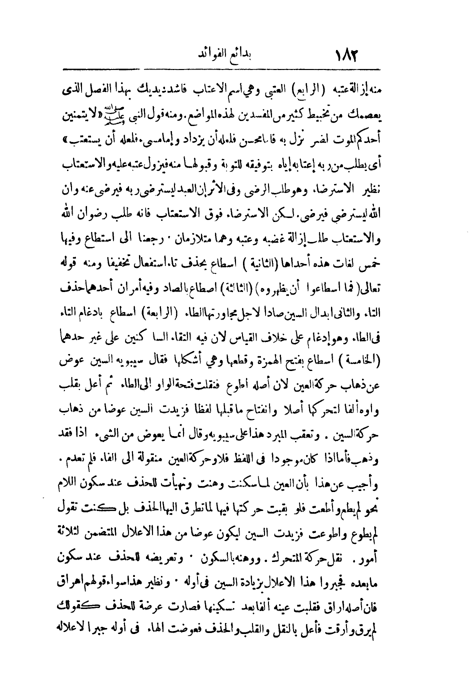 الرابع: العتبي وهي اسم الإعتاب فاشدد يديك بهذا الفضل الذي يعصمك من تخبيط كثير من المفسدين لهذه المواضع ومنه قول النبي صلى الله عليه وسلم: "لا يتمنين أحدكم الموت لضر نزل له" فأما محسن فلعله أن يزداد وإما مسيء فلعله أن يستعتب أي يطلب من ربه إعتابه إياه بتوفيقه للتوبة وقبولها منه فيزول عتبة عليه، والاستعتاب نظير الاسترضاء وهو طلب الرضى وفي الأثر "إن العبد ليسترضي ربه فيرضى عنه" وإن الله ليسترضي فيرضى لكن الاسترضاء فوق الاستعتاب فإنه طلب رضوان الله تعالى والاستعتاب طلب إزالة غضبه وعتبه وهما متلازمان.