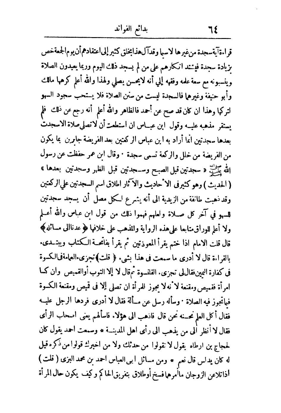 قراءة آية سجدة من غيرها لاسيما وقد آل هذا بخلق كثير إلى اعتقادهم أن يوم الجمعة خص بزيادة سجدة فيشتد إنكارهم على من لم يسجد ذلك اليوم وربما يعيدون الصلاة وينسبونه مع سعة علمه وفقهه إلى أنه لا يحسن يصلي ولهذا والله أعلم كرهها مالك وأبو حنيفة وغيرها فالسجدة ليست من سنن الصلاة فلا يستحب سجود السهو لتركها وهذا إن كان قد صح عن أحمد فالظاهر والله أعلم أنه رجع عن ذلك فلم يستقر مذهبه عليه وقول ابن عباس: "إن استطعت أن لا تصلي صلاة إلا سجدت بعدها سجدتين" إنما أراد به ابن عباس الركعتين بعد الفريضة جابرين بما يكون من الفريضة من خلل والركعة تسمى سجدة وقال ابن عمر: "حفظت عن رسول الله صلى الله عليه وسلم سجدتين قبل الصبح وسجدتين قبل الظهر وسجدتين بعدها" الحديث. وهو كثير في ألأحاديث والآثار إطلاق اسم السجدتين على الركعتين.