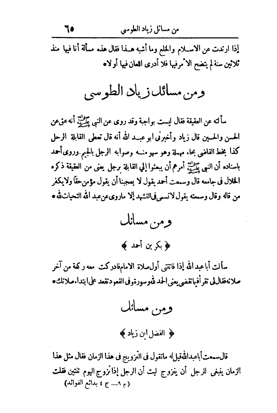قال: سمعت أبا عبد الله قيل له: ما تقول في التزويج في هذا الزمان؟ فقال: "مثل هذا الزمان ينبغي للرجل أن يتزوج ليت أن الرجل إذا تزوج اليوم ثنتين". فقلت: