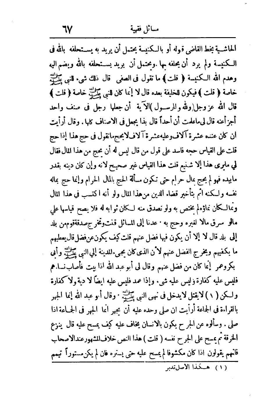 الحاشية بخط القاضي قوله: "أو بالكنيسة يحتمل أن يريد به يستحلفه بالله في الكنيسة ولم يرد أن يحلفه بها ويحتمل أن يريد يستحلفه بالله ويضم إليه وهدم الله الكنيسة".