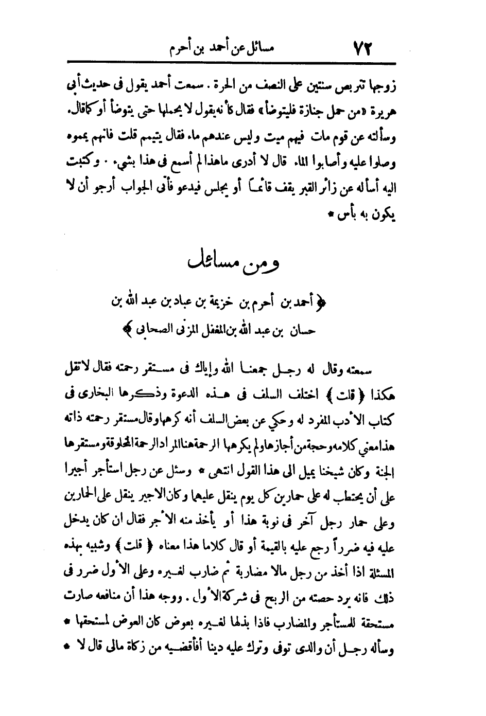 ومن مسائل أحمد بن أحرم بن خزيمة بن عباد بن عبد الله ابن حسان بن عبد الله بن المغفل المزني الصحابي: