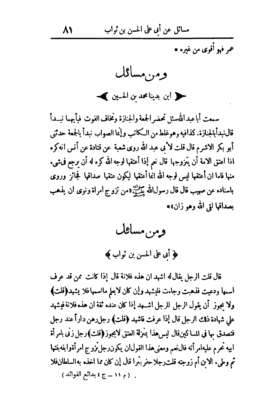 ومن مسائل أبي علي الحسن بن ثوبان: