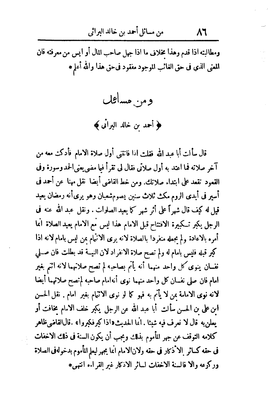 قال سألت أبا عبد الله فقلت: إذا فاتتني أول صلاة الإمام فأدركت معه من آخر صلاته فما أعتد به أول صلاتي فقال: "تقرأ فيما مضي يعني الحمد وسورة وفي العقود تقعد على ابتداء صلاتك"