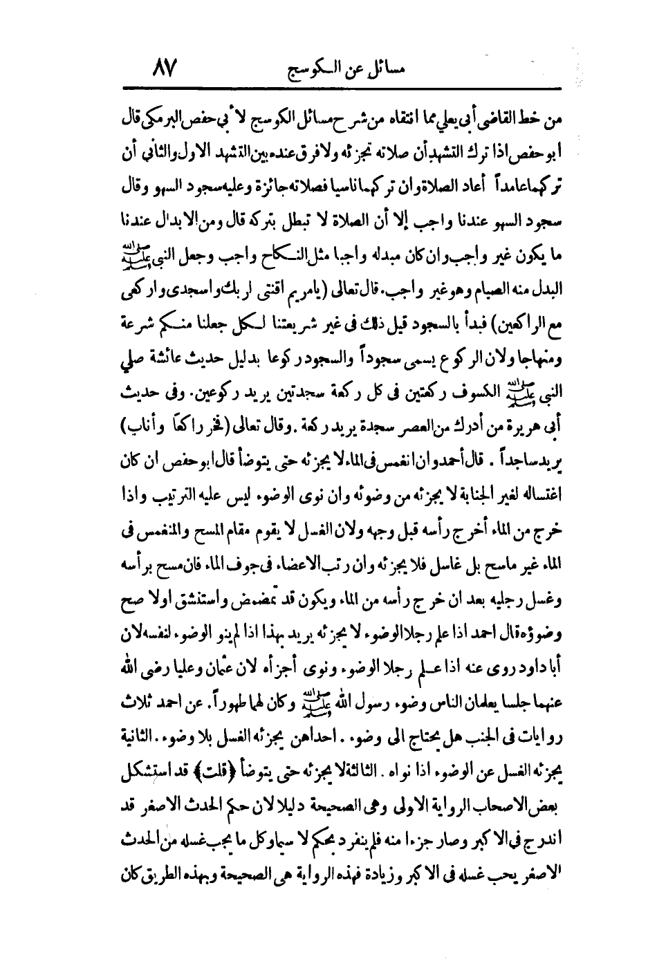 من خط القاضي أبي يعلى مما انتقاه من شرح مسائل الكوسج لأبى حفص البرمكي قال أبو حفص: "إذا ترك التشهد أن صلاته تجزئه ولا فرق عنده بين التشهد الأول والثاني إن تركهما عامدا أعاد الصلاة وإن تركهما ناسيا فصلاته جائزة وعليه سجود السهو".