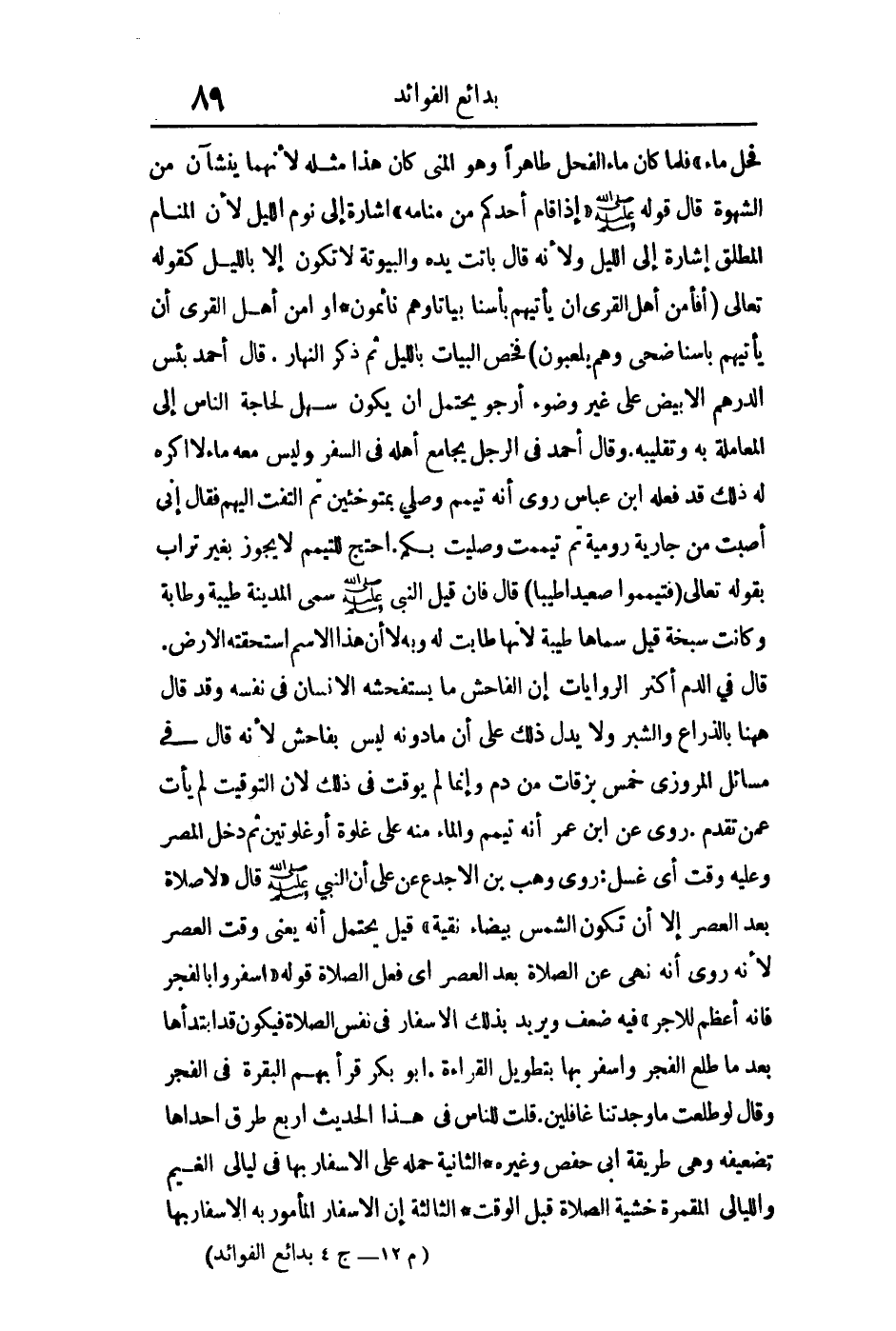 روى عن ابن عمر "أنه تيمم والماء منه على غلوة أو غلوتين ثم دخل المصر وعليه وقت أي غسل" روى وهب بن الأجدع عن علي أن النبي صلى الله عليه وسلم قال: "لا صلاة بعد العصر إلا أن تكون الشمس بيضاء نقية " قيل يحتمل أنه يعنى وقت العصر لأنه روي أنه نهي عن الصلاة بعد العصر أي فعل الصلاة قوله: " اسفروا بالفجر فإنه أعظم للأجر ".فيه ضعف ويريد بذلك الإسفار في نفس الصلاة فيكون قد ابتدأها بعدها طلع الفجر وأسفر بها بتطويل القراءة.