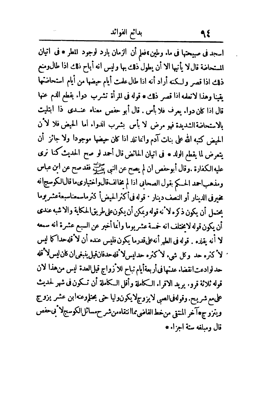 وقوله في المرأة تشرب دواء يقطع الدم عنها؟ قال: "إذا كان دواء يعرف فلا بأس". قال أبو حفص: "معناه عندي إذا ابتليت بالاستحاضة الشديدة فهو مرض لا بأس بشرب الدواء أما الحيض فلا لأن الحيض كتبه الله على بنات آدم وإنما تلد إذا كان حيضها موجودا ولا جائز أن يتعرض لما يقطع الولد".
