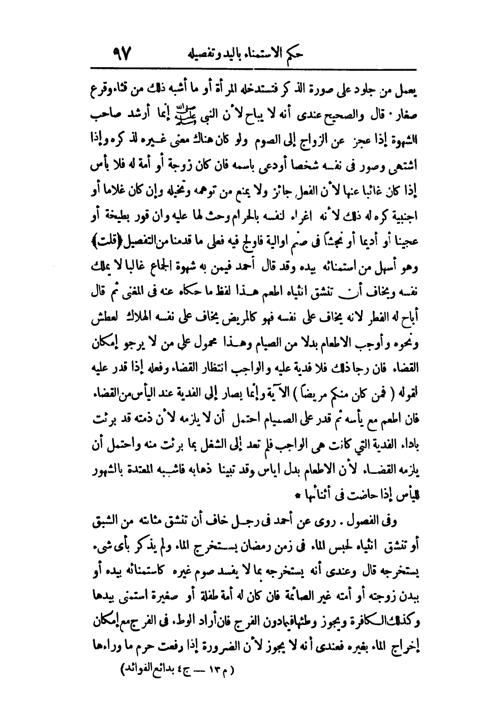 في الفصول روى عن أحمد في رجل خاف أن تنشق مثانته من الشبق أو تنشق انثياه لحبس الماء في زمن رمضان يستخرج الماء ولم يذكر بأي شيء يستخرجه قال: "وعندي أنه يستخرجه بما لا يفسد صوم غيره كاستمنائه بيده أو ببدن زوجته أو أمته غير الصائمة فإن كان له أمة طفلة أو صغيرة استمنى بيدها وكذلك الكافرة ويجوز وطؤها فيما دون الفرج فإن أراد الوطء في الفرج مع إمكان إخراج الماء بغيره فعندي أنه لا يجوز لأن الضرورة إذا رفعت حرام ما وراءها