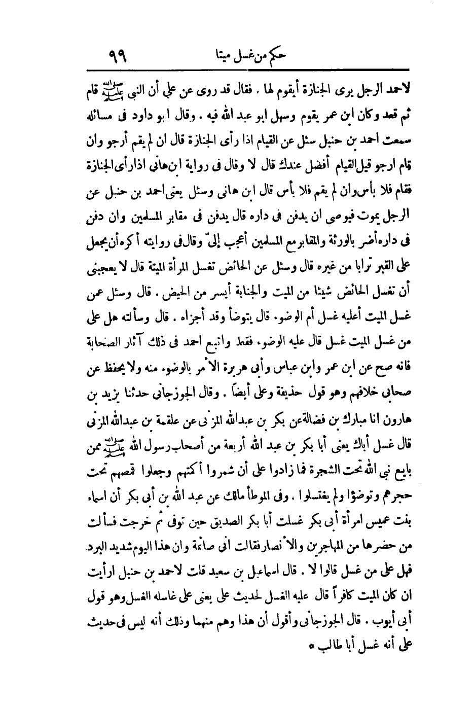 قال: وسألته هل على من غسل الميت غسل قال: "عليه الوضوء فقط" واتبع أحمد في ذلك آثار الصحابة فإنه صح عن ابن عمر وابن عباس وأبي هريرة الأمر بالوضوء منه ولا يحفظ عن صحابي خلافهم وهو قول حذيفة وعلى أيضا.