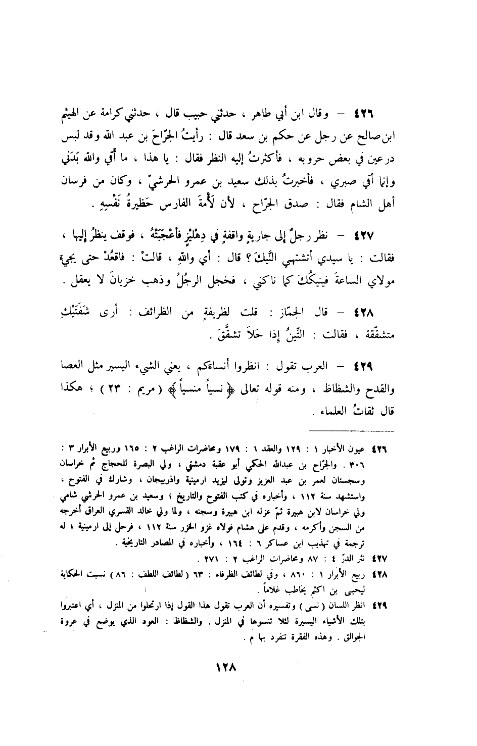 وقال ابن أبي طاهر، حدثني حبيب قال، حدثني كرامة عن الهيثم ابن صالح عن رجل عن حكم بن سعد قال: رأيت الجراح بن عبد الله وقد لبس درعين في بعض حروبه، فأكثرت إليه النظر فقال: يا هذا، ما أقي والله بدني وإنما أقي صبري، فأخبرت بذلك سعيد بن عمرو الحرشي، وكان من فرسان أهل الشام فقال: صدق الجراح، لأن لأمة الفارس حظيرة نفسه.