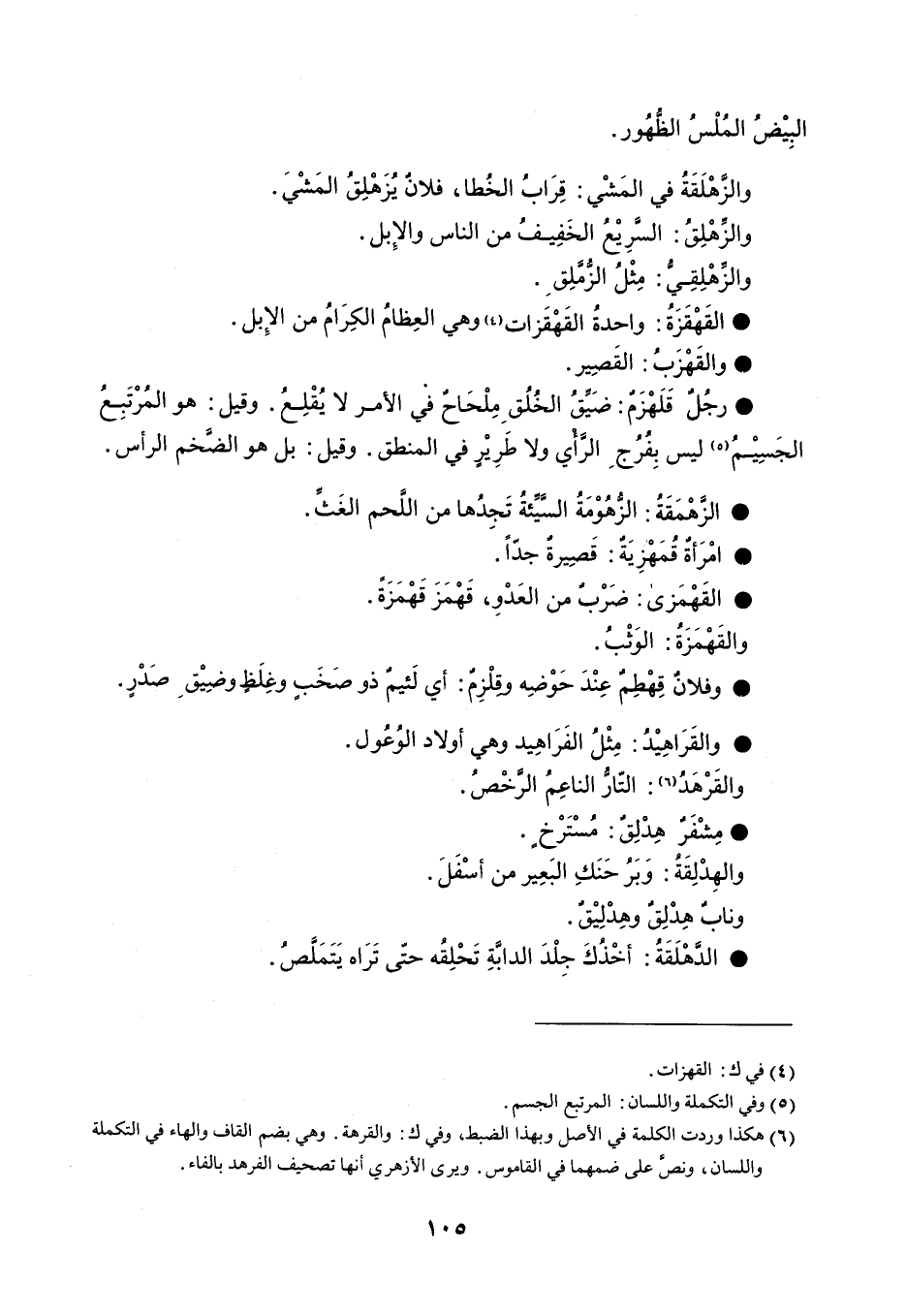 البيض الملس الظهور . والزهلقة في المشي قراب الخطا ، فلان يزهلق المشي . والزهلق السريع الخفيف من الناس والإبل . والزهلقي مثل الزملق . القهقزة واحد القهقزات وهي العظام الكرام من الإبل . والقهزب القصير . رجل قلهزم ضيق الخلق ملحاح في الأمر لا يقلع . وقيل هو المرتبع الجسيم ليس بفرج الرأي ولا طرير في المنطق . وقيل بل هو الضخم الرأس . الزهمقة الزهومة السيئة تجدها من اللحم الغث . امرأة قهمزية قصيرة جداً . القهمزى ضرب من العدو ، قهمز قهمزة . والقهمزة الوثب . وفلان قهطم عند حوضه وقلزم أي لئيم ذو صخب وغلظ وضيق صدر . والقراهيد مثل الفراهيد وهي أولاد الوعول . والقرهد التَّار الناعم الرخص . مشفر هدلق مسترخٍ . والهدلقة وبر حنك البعير من أسفل . وناب هدلق وهدليق . الدهلقة أخذك جلد الدابة تحلقه حتى تراه يتملص .