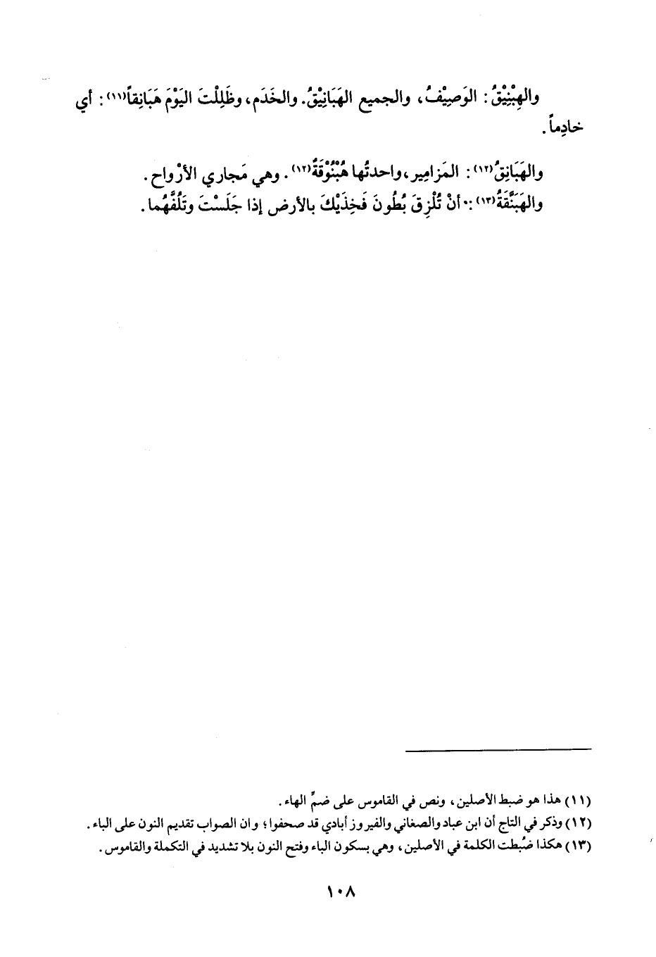 والهبنيق الوصيف ، والجمع الهبانيق ، وظلت اليوم هبانقاً أي خادماً . والهبانق المزامير ، واحدها هبنوقة . وهي مجاري الأرواح . والهبنقة أن تلزق بطون فخذيك بالأرض إذا جلست وتلفهما .
