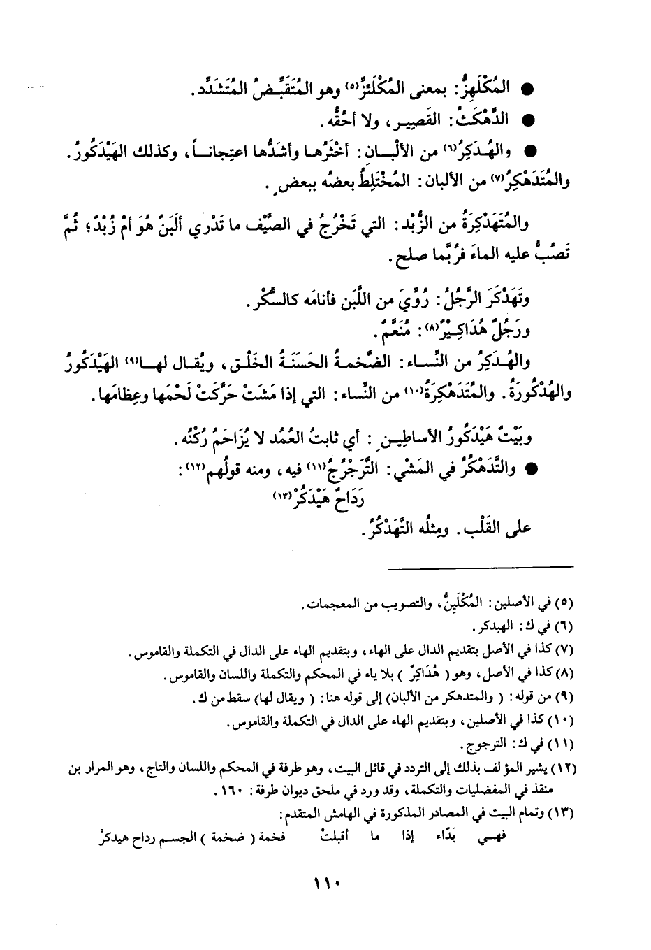المكلهز بمعنى المكلئز وهو المتقبض المتشدد . الدهكث القصير ، ولا أحقه . والهدكر من الألبان أخثرها وأشدها اعتجانا ، وكذلك الهيدكور . والمتدهكر من الألبان المختلط بعضه ببعض . والمتهدكرة من الزبد التي تخرج في الصيف ما تدري ألبن هو أم زبد ؛ تصب عليه الماء فربما صلح . وتهدكر الرجل روي من اللبن فأنامه كالسكر . ورجل هداكير منعم . والهدكر من النساء الضخمة الحسنة الخلق ، ويقال لها الهيدكور والهدكورة . والمتدهكرة من النساء التي إذا مشت حركت لحمها وعظامها . وبيت هيدكور الأساطين أي ثابت العمد لا يزاحم ركنه . والتدهكر في المشي الترجرج فيه ، ومنه قولهم رداح هيدكر على القلب . ومثله التهدكر .