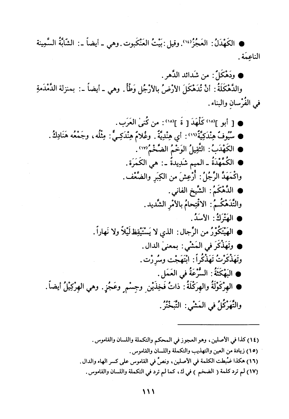 الكهدل العجز . وقيل بيت العنكبوت . وهي - أيضاً - الشابة السمينة الناعمة . ودهكل من شدائد الدهر . والدهكلة أن تدهكل الأرض بالأرجل وطئاً . وهي - أيضا - بمنزلة الدمدمة في الفرسان والبناء . أبو كلهدة من كنى العرب . سيوف هندكية أي هندية . وعلام هندكي مثله ، وجمعه هنادك . الكهدب الثقيل الوخم الضخم . الكمهدة - الميم شديدة - هي الكمرة . واكمهد الرجل أرعش من الكبر الضعف . الدهكم الشيخ الفاني . والتدهكم الاقتحام بالأمر الشديد . الهترك الأسد . الهيتكور من الرجال الذي لا يستيقظ ليلاً ولا نهاراً . وتهذكر في المشي بمعنى الدال . وتهذكرت تهذكراً ابتهجت وسررت . البهثكة السرعة في العمل . الهركولة والهركلة ذات فخذين وجسم وعجز . وهي الهركيل أيضاً . والتهركل في المشي التبختر .