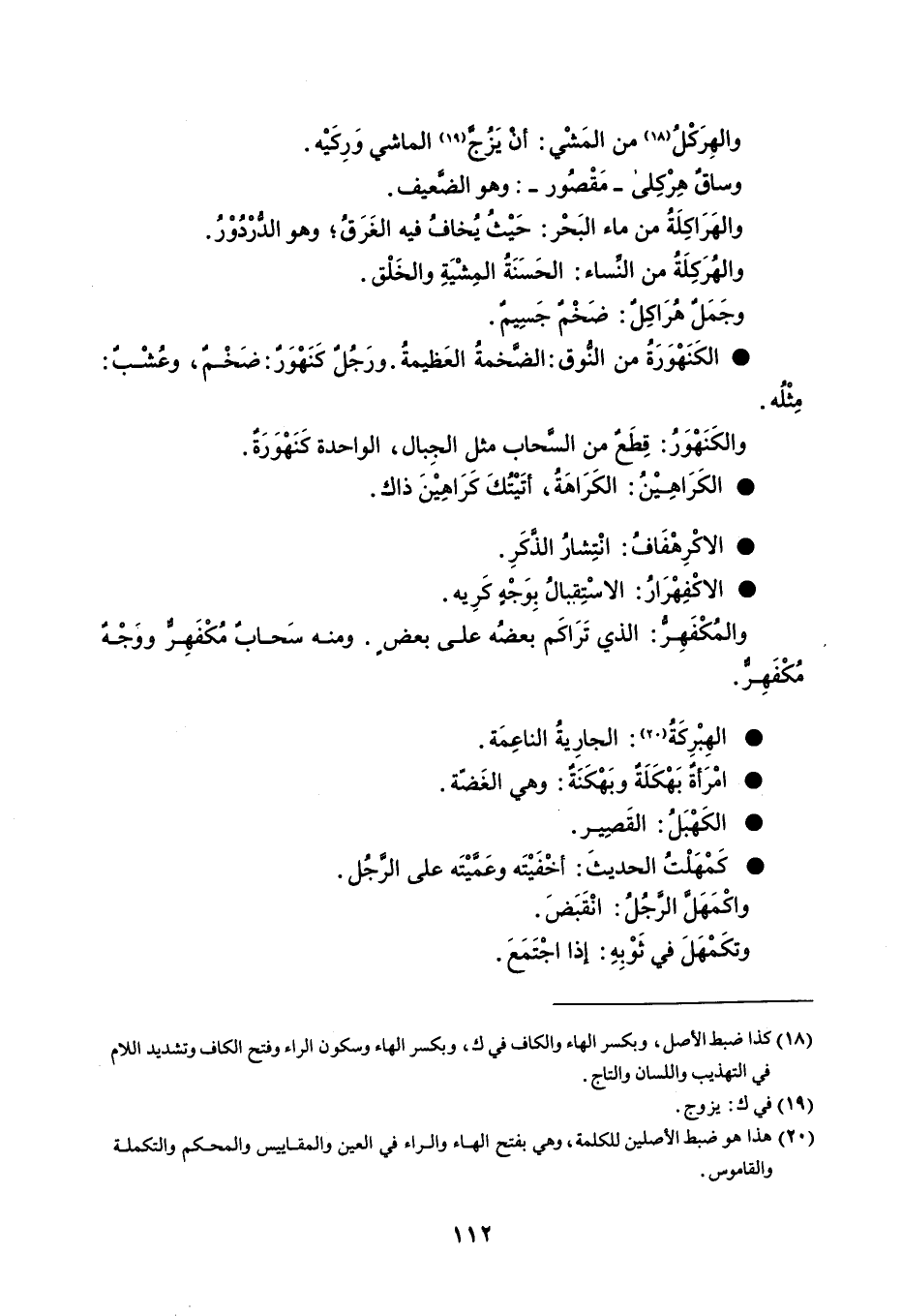 والهركل من المشي أن يزج الماشي وركيه . وساق هركلى - مقصور - وهو الضعيف . والهراكلة من ماء البحر حيث يخاف فيه الغرق ؛ وهو الدردور . والهركلة من النساء الحسنة المشية والخلق . وجمل هراكيل ضخم جسيم . الهنكورة من النوق الضخمة العظيمة . ورجل كنهور ضخم ، وعشب مثله . والكنهور قطع من السحاب مثل الجبال ، الواحدة كنهورة . الكراهين الكراهة ، أتيتك كراهين ذلك . الاكرهفاف انتشار الذكر . الاكفهرار الاستقبال بوجه كريه . والمكفهر الذي تراكم بعضه على بعض . ومنه سحاب مكفهر ووجه مكفهر . الهبركة الجارية الناعمة . امرأة بهكلة وبهكنة وهي الغضة . الكهبل القصير . كمهلت الحديث أخفيته وعميته على الرجل . واكمهل الرجل انقبض . وتكهمل في ثوبه إذا اجتمع .