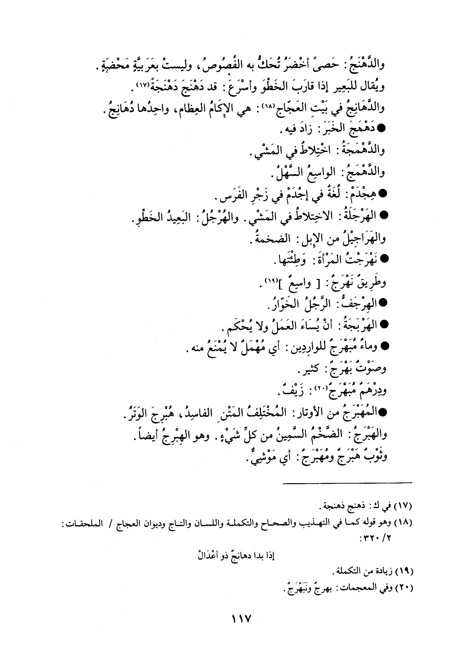 والدهنج حصى أخضر تحك به الفصوص ، وليست بعربية محضة . ويقال للبعير إذا قارب الخطو وأسرع قد دهنحج دهنجة . والدهانج في بيت العجاج هي الإكام العظام ، واحدها دهانج . دهمج الخبر زاد فيه . والدهمجة اختلاط في المشي . والدهمج الواسع السهل . هجدم لغة في إجدم في زجر الفرس . الهرجلة الاختلاط في المشي . والهرجل البعيد الخطو . والهراجيل من الإبل الضخمة . نهرجت المرأة وطئتها . وطريق نهرج واسع . الهرجف الرجل الخوار . الهربجة أن يساء العمل ولا يحكم . وماء مبهرج للواردين أي مهمل لا يمنع منه . وصوت بهرج كثير . ودرهم مبهرج زيف . المهبرج من الأوتار المختلف المتن الفاسد ، هبرج الوتر . والهبرج الضخم السمين من كل شيء . وهو الهبرج أيضا . وثوب هبرج ومهبرج أي موشيٌّ .