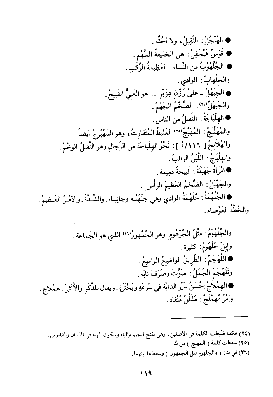 الهنجل الثقبل ، ولا أحقه . قوس هيجفل هي الخفيفة السهم . الجلهوب من النساء العظمية الركب . والجلهاب الوادي . الجبهل - على وزن هزبر - هو العيي القبيح . والجبهل الضخم الجهم . الهلباجة الثقيل من الناس . والمهلبج المهبج الغليظ المتفاوت ، وهو المهبوج أيضاً . والهلابج 116 أ نحو الهلباجة من الرجال وهو الثقيل الوخم . والهلباج اللبن الرائب . امرأة جهبلة قبيحة دميمة . والجهبل الضخم العظيم الرأس . الجلهمة جلهمة الوادي وهي جلهته وجانباه . والشدة . والأمر العظيم . والخطة العوصاء . والجلهوم مثل الجرهوم وهو الجمهور الذي هو الجماعة . وإبل جلهوم كثيرة . اللهجم الطريق الواضح الواسع . وتلهجم الجمل صوت وصرف نابه . الهملاج حسن سير الدابة في سرعة وبخترة . ويقال للذكر والأنثى هملاج . وأمر مهملج مذلل منقاد .