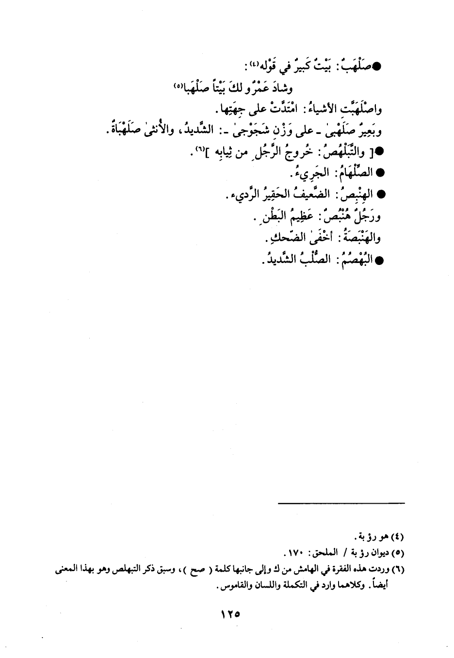 صهلب بيت كبير في قوله وشاد عمروٌ لك بيتاً صهلبا واصلهبت الأشياء : امتدت على جهتها . وبعير صلهبى - على وزن شجوجى - : الشديد ، والأنثى صلهباة . والتبلهص خروج الرجل من ثيابه . الصلهام الجريء . الهنبص الضعيف الحقير الرديء . ورجل هنبص عظيم البطن . والهنبصة أخفى الضحك . البهصم الصلب الشديد .