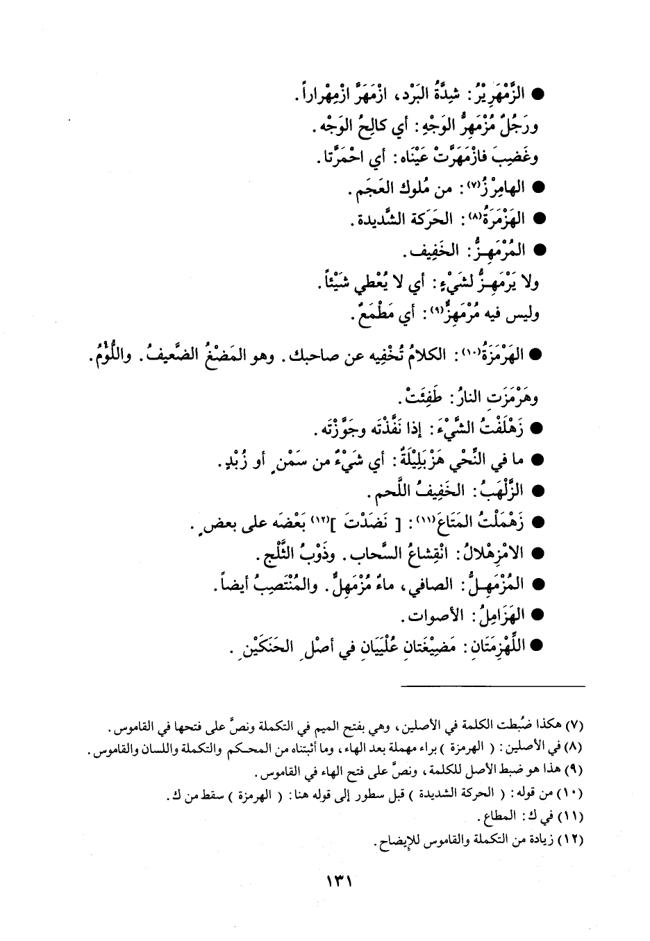 الزمهرير شدة البرد ، ازمهر ازمهراراً . ورجل مزمهر الوجه أي كالح الوجه . وغضب فازمهرت عيناه أي احمرتا . الهامرز من ملوك العجم . الهزمرة الحركة الشديدة . المرمهز الخفيف . ولا يرمهز لشيء أي يعطي شيئا . وليس فيه مرمهز أي مطمع . الهرمزة الكلام تخفيه عن صاحبك . وهو المضغ الضعيف . واللؤم . وهرمزت النار طفئت . زهلفت الشيء إذا نفذته وجوزته . ما في النحي هزبليلة أي شيء من سمن أو زبد . الزلهب الخفيف اللحم . زهلمت المتاع نضدت بعضه على بعض . الامزهلال انقشاع السحاب . وذوب الثلج . المزمهل الصافي ، ماء مزمهل . والمنتصب أيضا . الهزامل الأصوات . اللهزمتان مضيغتان علييان في أصل الحنكين .