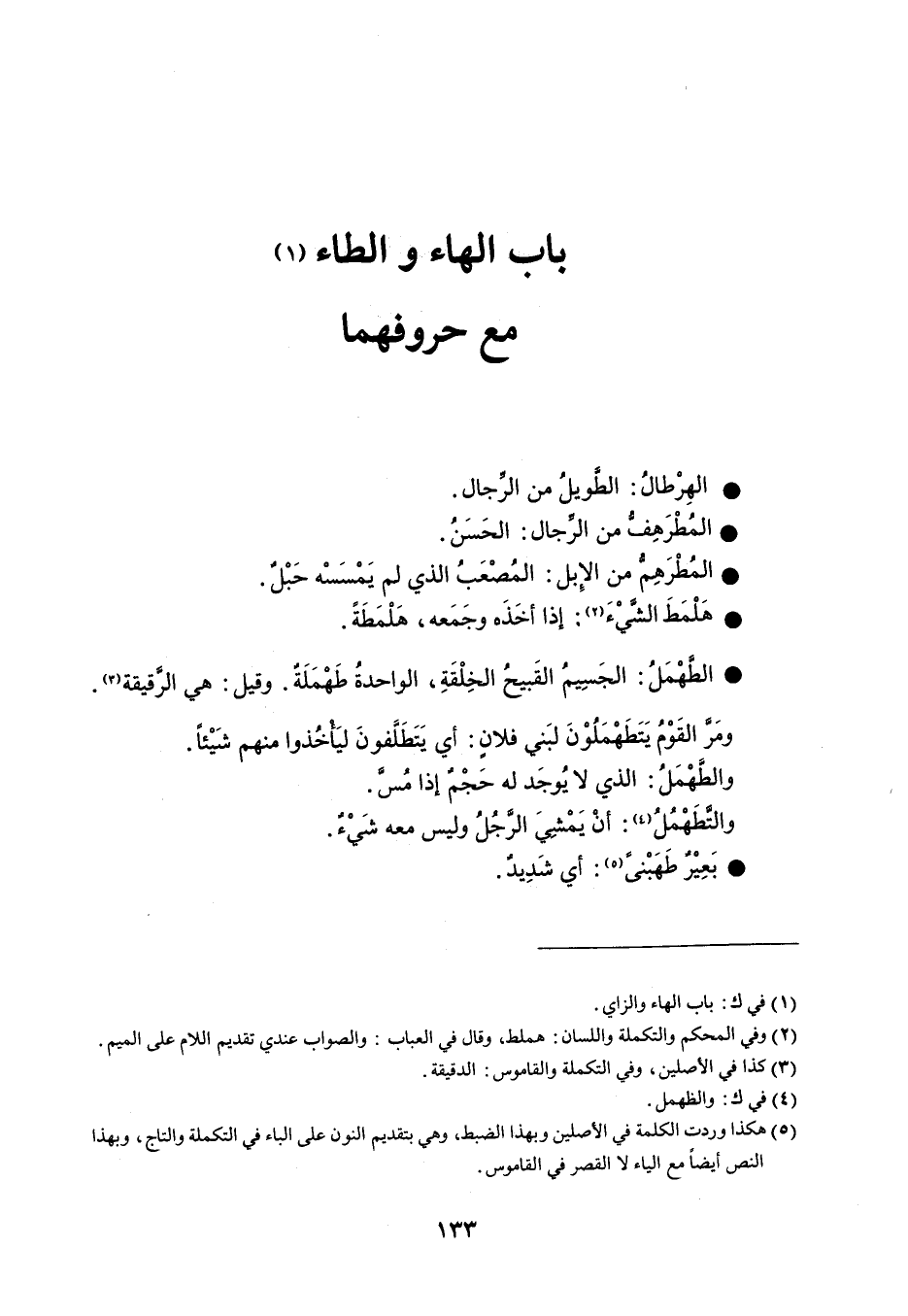 الهرطال الطويل من الرجال . المطرهف من الجال الحسن . المطرهم من الإبل المصعب الذي لم يمسسه حبل . هلمط الشيء إذا أخذه وجمعه ، هلمطة . الطهمل الجسيم القبيح الخلقة والواحدة طهملة . وقيلهي الرقيقة . ومر القوم يتطهملون لبني فلان أي يتطلفون ليأخذوا منهم شيئاً . والطهمل الذي لا يوجد له حجم إذا مس . والتطهمل أن يمشي الرجل وليس معه شيء . بعير طهبنى أي شديد . باب