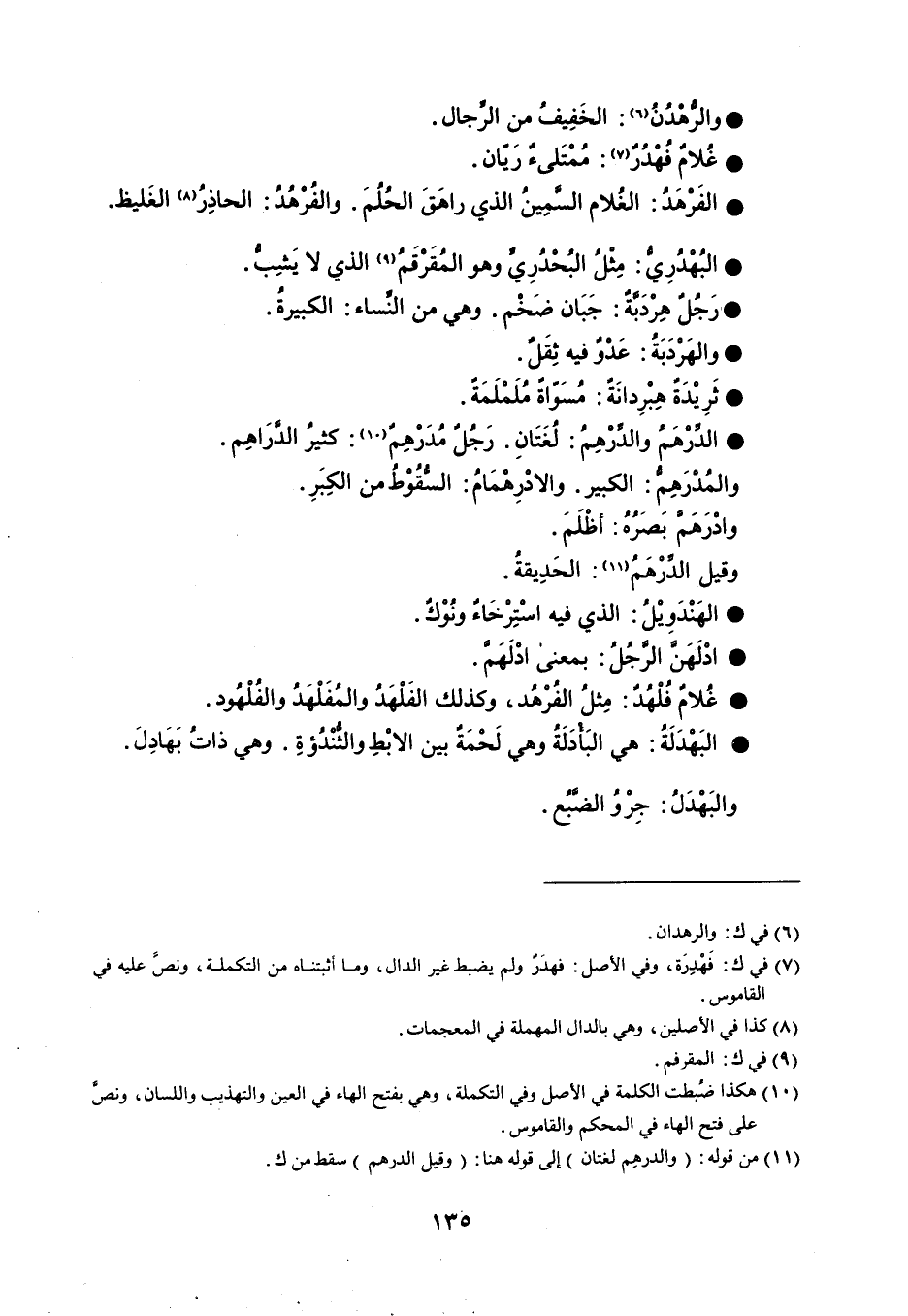 والرهدن الخفيف من الرجال . غلام فرهد الغلام السمين الذي راهق الحلم . والفرهد الحاذر الغليظ . البهدري مثل البحدري وهو المقرقم الذي لا يشيب . رجل هردبة جبان ضخم . وهي من النساء الكبيرة . والهردبة عدو فيه ثقل . ثريدة هبردانة مسواة ململمة . الدرهم والدرهم لغتان . رجل مدرهم كثير الدراهم . والمدرهم الكبير . والادرهمام السقوط من الكبر . وادرهم بصره أظلم . وقيل الدرهم الحديقة . الهندويل الذي فيه استرخاء ونوك . ادلهن الرجل بمعنى ادلهم . غلام فلهد مثل الفرهد ، وكذلك الفلهد والمفلهد والفلهود . البهدلة هي البأدلة وهي لحمة بين الإبط والثندؤة . وهي ذات بهادل . والبهدل جرو الضبع .