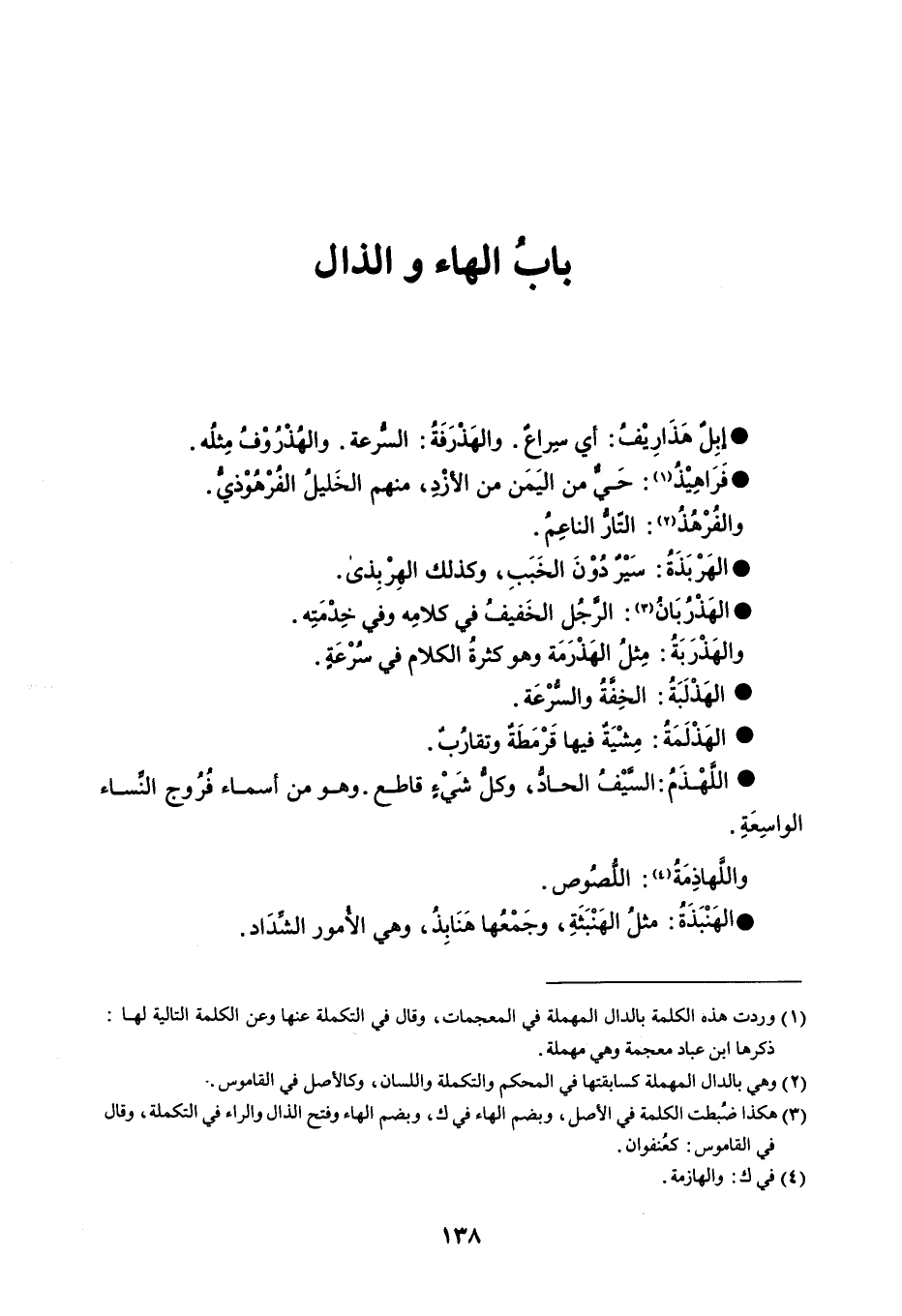 إبل هذاريف أي سراع . والهذرفة السرعة . والهذروف مثله . فراهيذ حي من اليمن من الأزد ، منهم الخليل الفرهوذي . والفرهذ التار الناعم . الهربذة سير دون الخبب ، وكذلك الهربذى . الهذربان الرجل الخفيف في كلامه وفي خدمته . والهذربة مثل الهذرمة وهو كثرة الكلام في سرعة . الهذبلة الخفة والسرعة . الهذلمة مشية فيها قرمطة وتقارب . اللهذم السيف الحاد ، وكل شيء قاطع . وهو من أسماء فروج النساء الواسعة . واللهاذمة اللصوص . الهنبذة مثل الهنبثة ، وجمعها هنابذ ، وهي الأمور الشداد .