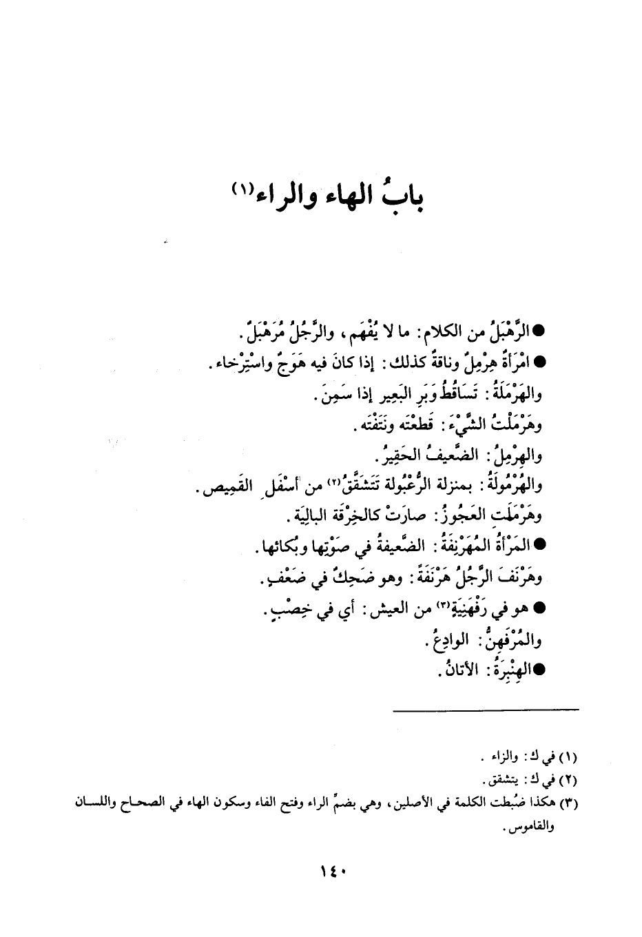 الرهبل من الكلام ما لا يفهم ، والرجل مرهبل . امرأة هرمل وناقة كذلك إذا كان فيه هوج واسترخاء . والهرملة تساقط وبر البعير إذا سمن . وهرملت الشيء قطعته ونتفته . والهرمل الضعيف الحقير . والهرمولة بمنزلة الرعبولة تتشقق من أسفل القميص . وهرملت العجوز صارت كالخرقة البالية . المرأة المهرنفة الضعيفة في صوتها وبكائها . وهرنف الرجل هرنفة وهو ضحك في ضعف . هو في رفهنية من العيش أي في خصب . والمرفهن الوادع . الهنبرة الأتان .