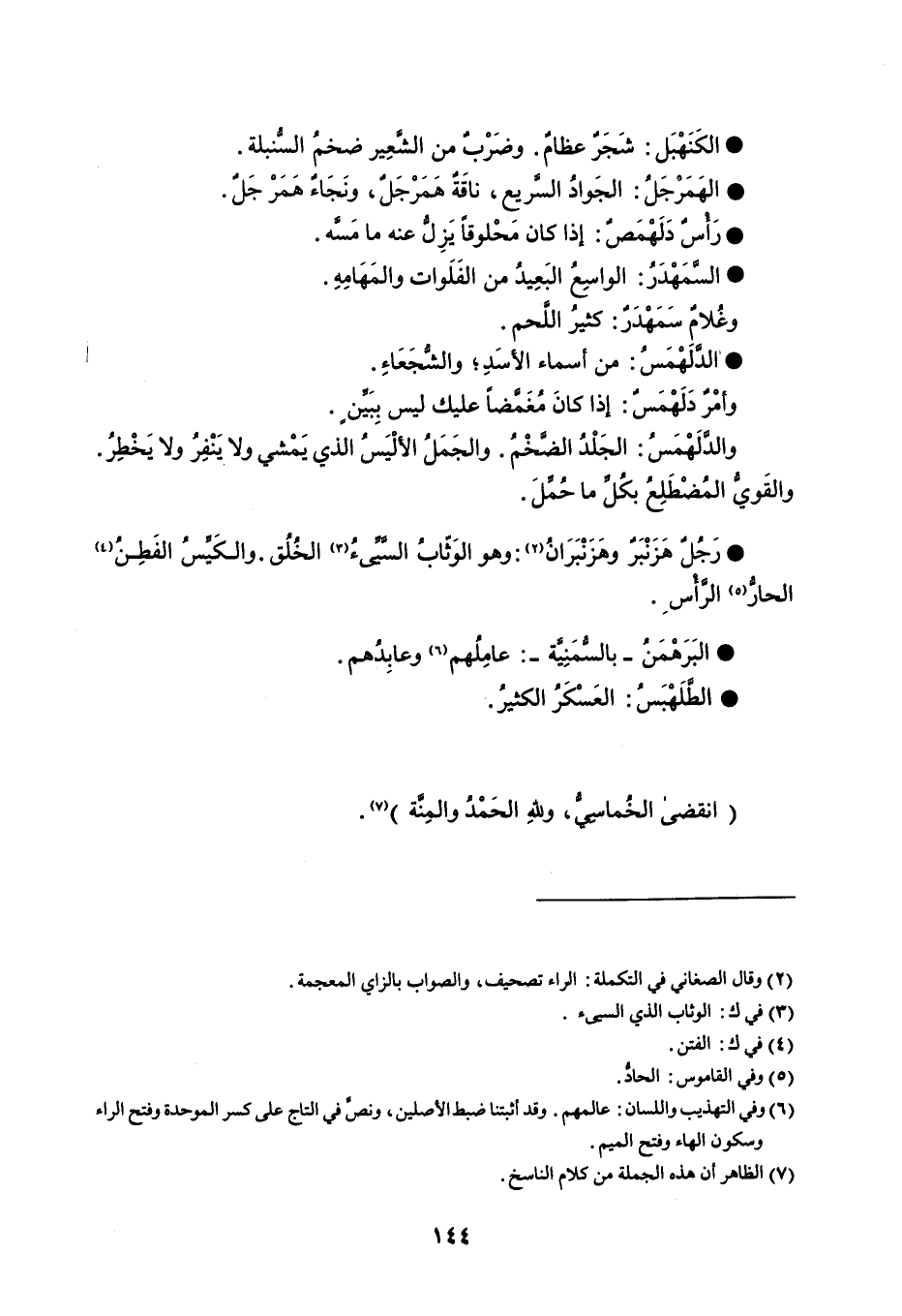 الكنهبل شجر عظام . وضرب من الشعير ضخم السنبلة . الهمرجل الجواد السريع ، ناقة همرجل ، ونجاء همرجل . رأس دلهمص إذا كان محلوقا يزل عنه ما مسه . السمهدر الواسع البعيد من الفلوات والمهامه . وغلام سمهدر كثير اللحم . الدلهمس من أسماء الأسد ؛ والشجعاء . وأمر دلهمس إذا كان مغمضا عليك ليس بين . والدلهمس الجلد الضخم . والجمل الأليس الذي يمشي ولا ينفر ولا يخطر . والقوي المضطلع بكل ما حمل . رجل هزنبر وهزنبران وهو الوثاب السيئ الخلق . والكيس الفطن الحار الرأس . البرهمن - بالسمنية - عاملهم وعابدهم . الطلهبس العسكر الكثير . انقضى الخماسي ، ولله الحمد والمنة . ؟