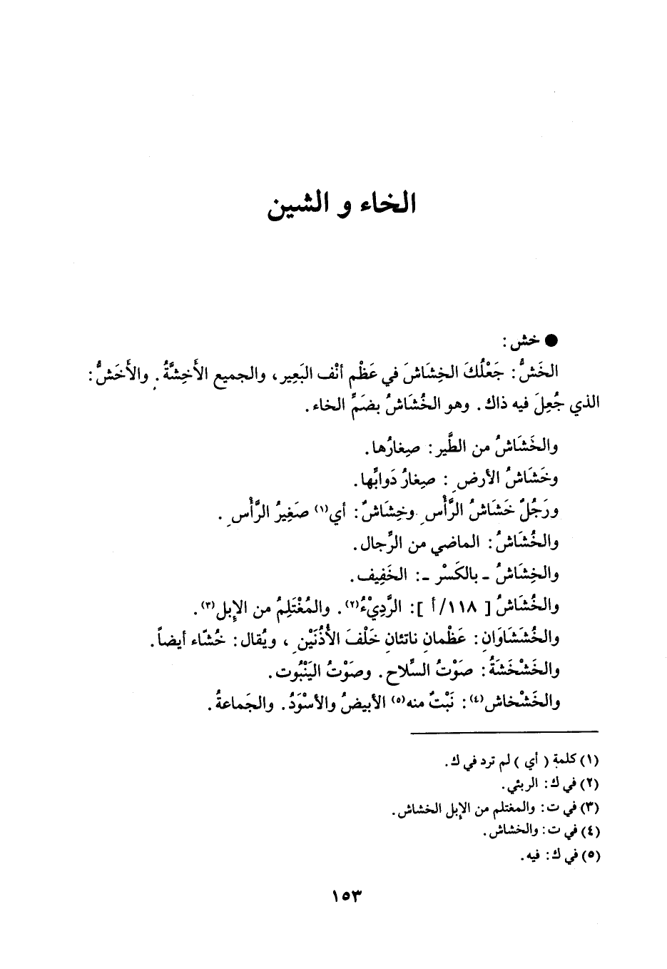 خش الخش جعلك الخشخاش في عظم أنف البعير ، والجميع الأخشة . والأخش الذي جعل فيه ذاك . وهو الخشاش بضم الخاء . والخشاش من الطير صغارها . وخشاش الأرض صغار دوابها . ورجل خشاش الرأس وخشاش أي صغير الرأس . والخشاش الماضي من الرجال . والخشاش - بالكسر - الخفيف . والخشاش 118 أ الرديء . والمغتلم من الإبل . والخششاوان عظمان ناتئان خلف الأذنين ، ويقال خشاء أيضاً . والخشخشة صوت السلاح . وصوت الينبوت . والخشخاش نبت منه الأبيض والأسود . والجماعة .