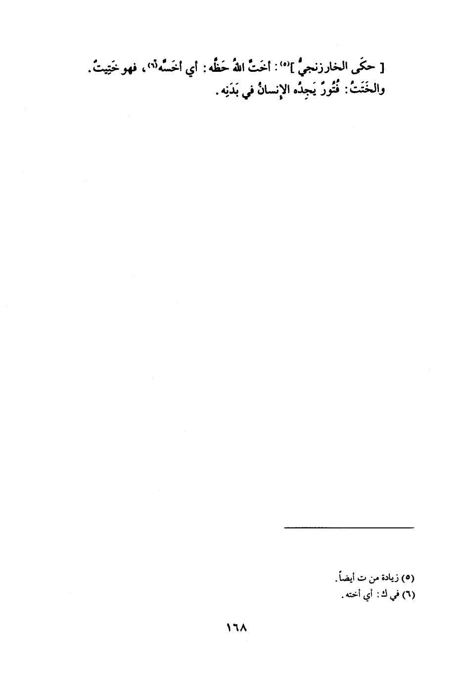 حكى الخارزنجي أخت الله حظه أي أخسه ، فهو ختيت . والختت فتور يجده الإنسان في بدنه .