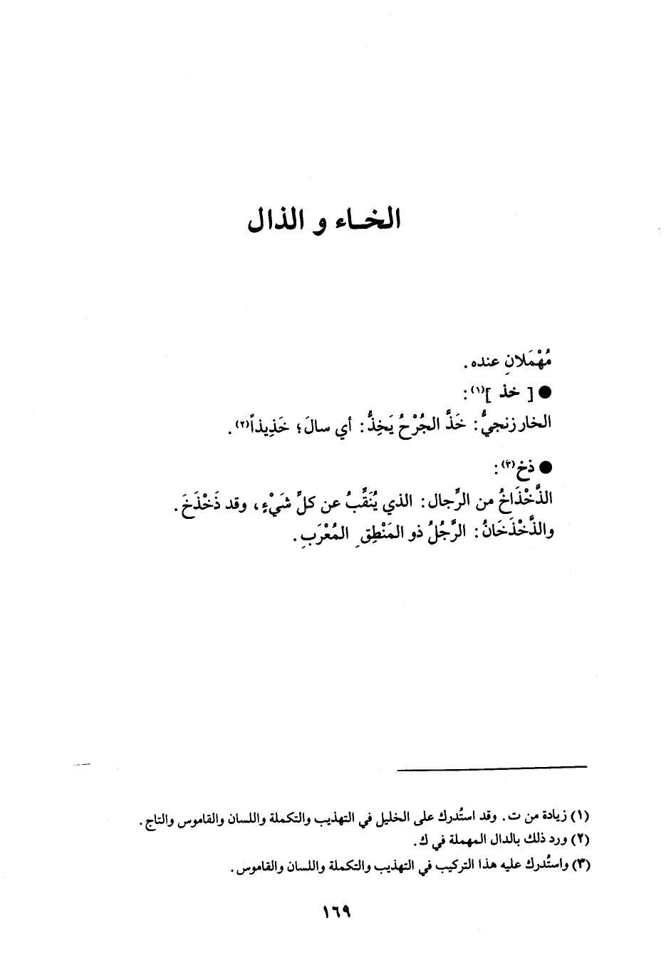 مهملان عنده . خذ الخارزنجي خذ الجرح يخ أي سال ؛ خذيذاً . ذخ الذخذاخ من الرجال الذي ينقب عن كل شيء ، وقد ذخذخ . والخذخان الرجل ذو المنطق المعرب .
