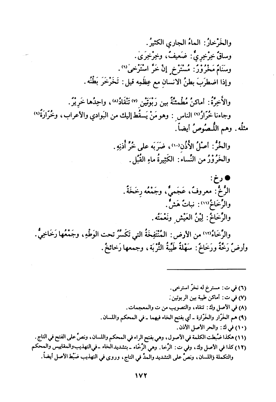 والخرخار الماء الجاري الكثير . وساق خرخري ضعيف ، وخرخرى . وسنام مخرور مسترخ إن خر استرخى . وإذا اضطرب بطن الإنسان مع عظمه قيل تخرخر بطنه . والأخرة أماكن مطمئنة بي ربوتين تنقاد ، واحدها خرير . وجاءنا خرار الناس وهو من يسق إليك من البوادي والأعراب ، وخرارة مثله . وهم اللصوص أيضاً . والخر أصل الأذن ، وضربه على خر أذنه . والخرور من النساء الكثيرة ماء القبل . رخ الرخ معروف ، عجمي ، وجمعه رخخة . والرخاخ نبات هش . والرخاخ لين العيش ونعمته . والرخاء من الأرض المنتفخة التي تكسر تحت الوطء ، وجمعها رخاخي . وأرض رخة ورخاخ سهلة طيبة التربة ، وجمعها رخائخ .