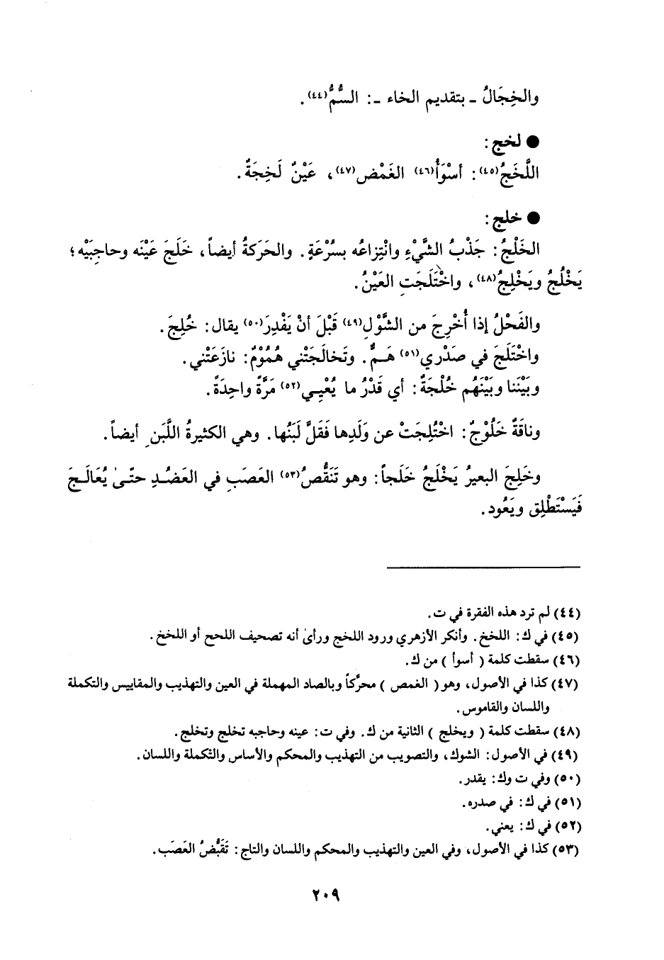 والخجال - بتقديم الخاء - السم . لخج اللخج أسوأ الغمض ، عين لخجة . خلج الخلج جذب الشيء وانتزاعه بسرعة . والحركة أيضاً ، خلج عينيه وحاجبيه ؛ يخلج ويخلج ، واختلجت العين . والفحل إذا أخرج من الشول قبل أن يفدر يقال خلج . واختلج فب صدري هم . وتخالجتني هموم تازعتني . وبيننا وبينهم خلجة أي قدر ما يعيي مرة واحدة . وناقة خلوج اختلجت عن ولدها فقل لبنها . وهي الكثيرة اللبن أيضاً . وخلج البعير يخلج خلجاً وهو تنقص العصب في العضد حتى يعالج فيستطلق ويعود .