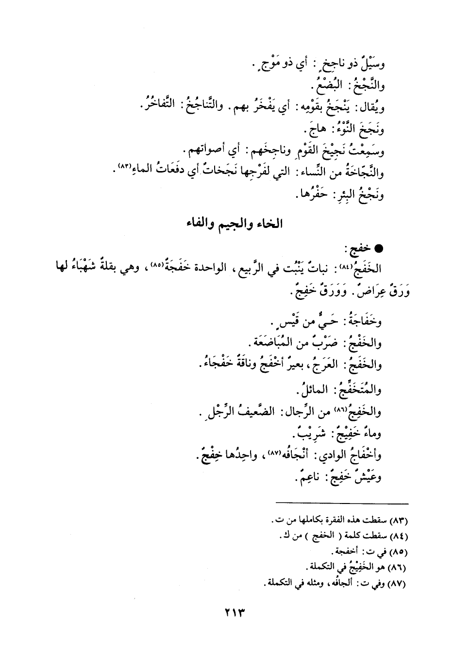 خفج الخفج نبات ينبت في الربيع ، الواحدة خفجة ، وهي بقلة شهباء لها ورق عراض . وورق خفج . وخفاجة حي من قيس . والخفج ضرب من المباضعة . والخفج العرج ، بعير أخفج وناقة خفجاء . والمتخفج المائل . والخفج من الرجال الضعيف الرجل . وماء خفيج شريب . وأخفاج الوادي أنجافه ، واحدها خفج . وعيش خفج ناعم .