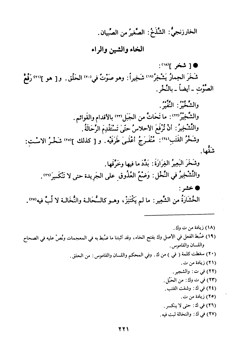شخر شخر الحمار يشخر شخيراً وهو صوت في الحلق . وهو رفع الصوت - أيضاً - بالنخر . والشخير النفير . والشخير ما تحات من الجبل بالأقدام والقوائم . والتشخير أن ترفع الأحلاس حتى تستقدم الرحالة . وشخر القتب منفرج أعلى طرفيه . وكذلك شخر الاست شقها . وشخر البعير الغرارة بدد ما فيها وخرقها . والتشخير في النخل وضع العذوق على الجريدة حتى لا تنكسر . خشر الخشارة من الشعير ما لم يكتنز ، وهو كالسحالة والنخالة لا لب فيه .