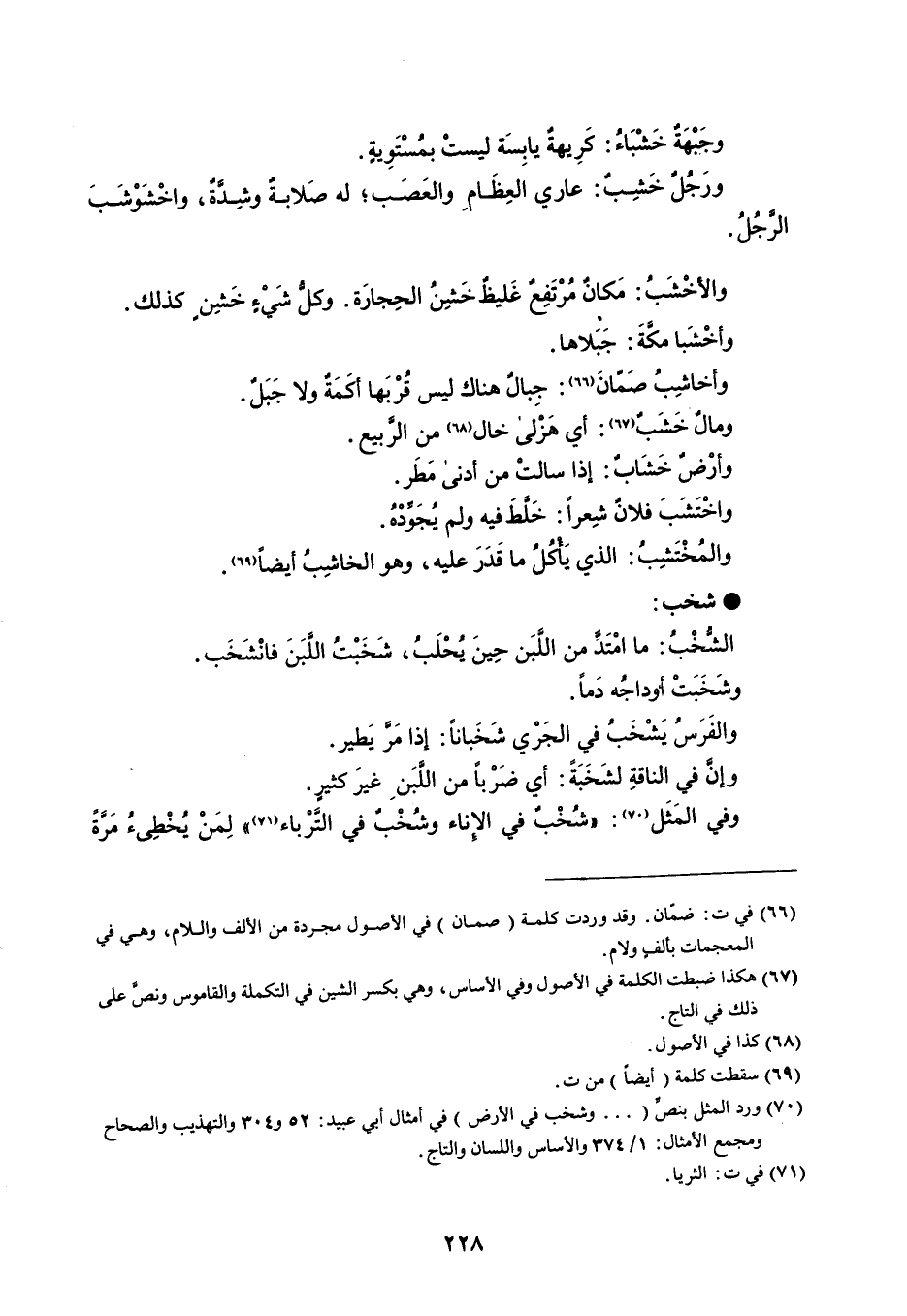 وجبهة خشباء كريهة يابسة ليست بمستوية . ورجل خشب عاري العظام والعصب ؛ له صلابة وشدة ، واخشوشب الرجل . والأخشب مكان مرتفع غليظ خشن الحجارة . وكل شيء خشن كذلك . وأخشبا مكة جبلاها . وأخاشب صمان جبال هناك ليس قربها أكمة ولا جبل . ومال خشب أي هزلى خال من الربيع . وأرض خشاب إذا سالت من أدنى مطر . واختشب فلان شعراً خلط فيه ولم يجوده . والمختشب الذي يأكل ما قدر عليه ، وهو الخاشب أيضاً . شخب الشخب ما امتد من اللبن حين يحلب ، شخبت اللبن فانشخب . وشخبت أوداجه دماً . والفرس يشخب في الجري شخباناً إذا مر يطير . وإن في الناقة لشخبة أي ضرباً من اللبن غير كثير . وفي المثل ' شخب في الإناء وشخب في الترباء ' لمن يخطئ مرة