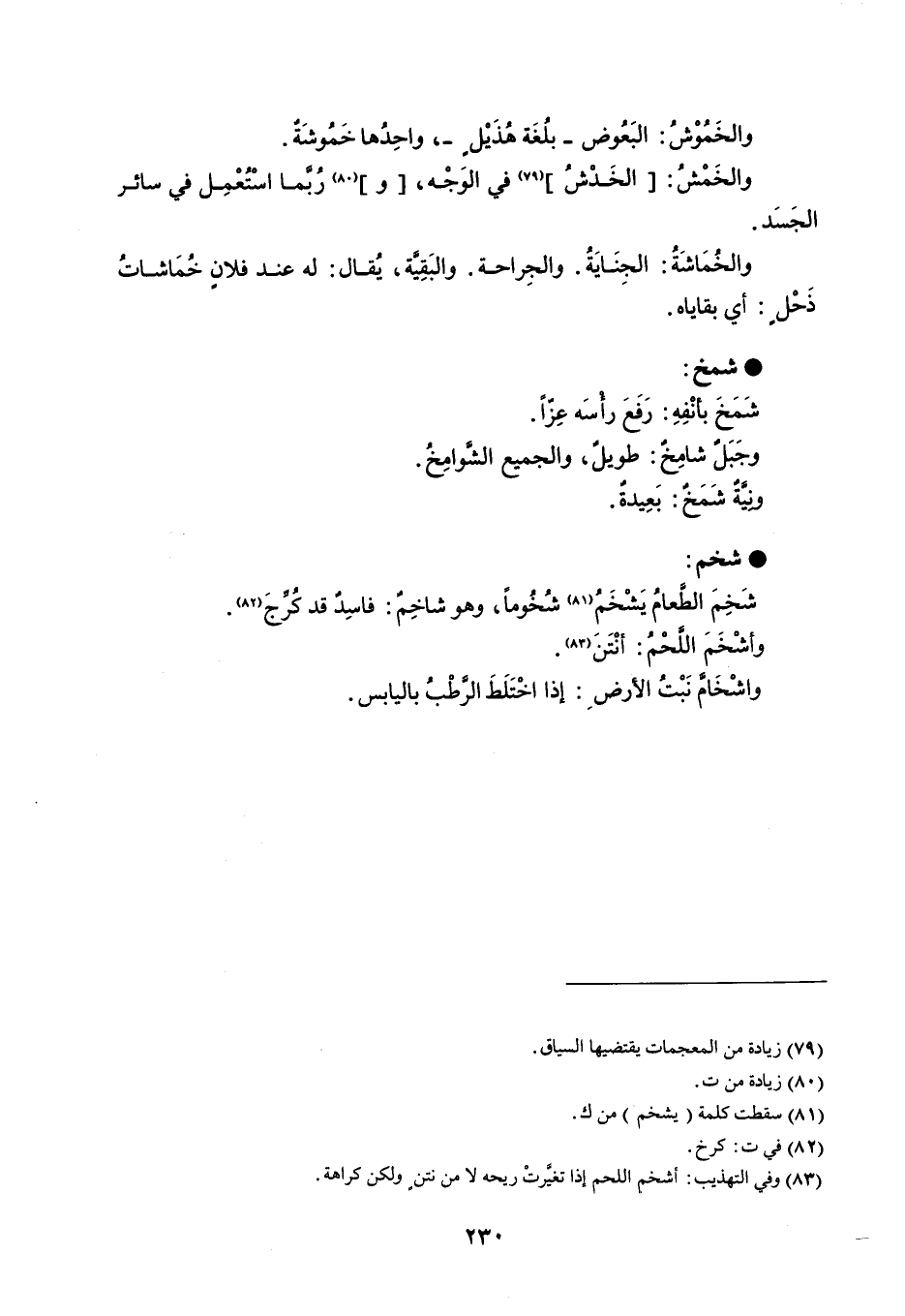 والخموش البعوض - بلغة هذيل - ، واحدها خموشة . والخمش الخدش في الوجه ، وربما استعمل في سائر الجسد . والخماشة الجناية . والجراحة . والبقية ، يقال له عند فلان خماشات ذحل أي بقاياه . شمخ شمخ بأنفه رفع رأسه عزاً . وجبل شامخ طويل ، والجميع الشوامخ . ونية شمخ بعيدة . شخم شخم الطعام يخشم شخوماً ، وهو شاخم فاسد قد كرج . وأشخم اللحم أنتن . واشخام نبت الأرض إذا اختلط الرطب باليابس .