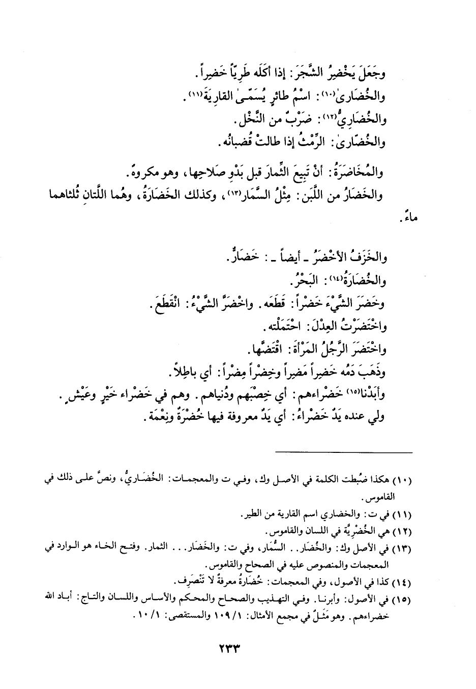 وجعل يخضر الشجر إذا أكله طرياً خضراً . والخضارى اسم طائر يسمى القارية . والخضارى الرمث إذا طالت قضبانه . والمخاضرة أن تبيع الثمار قبل بدو صلاحها ، وهو مكروه . والخضار من اللبن مثل السمار ، وكذلك الخضارة ، وهما اللتان ثلثاهما ماء . والخزف الأخضر - أيضاً - خضار . والخضارة البحر . وخضر الشيء خضراً قطعه . واخضر الشيء انقطع . واختضرت العدل احتملته . واختضر الرجل المرأة اقتضها . وذهب دمه خضراً مضراً وخضراً مضراً أي باطلاً . وأبدنا خضراءهم أي خصبهم ودنياهم . وهم في خضراء خير وعيش . ولي عنده يد خضراء أي يد معروفة فيها خضرة ونعمة .