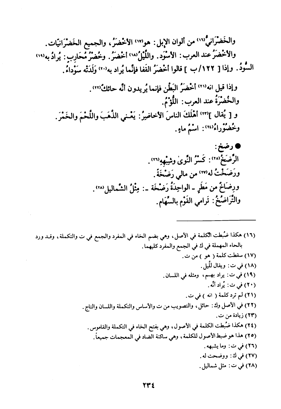 والخضراني من ألوان الإبل هو الأخضر ، والجميع الخضرانيات . والأخضر عند العرب الأسود . والليل أخضر . وخضر محارب يراد به السود . وإذا 122 ب قالوا أخضر القفا فإنما يراد به ولدته سوداء . وإذا إنه أخضر البطن فإنما يريدون أنه حائك . والخضرة عند العرب اللؤم . ويقال أهلك الناس الأخاضر يعني الذهب واللحم والخمر . وخضوراء اسم ماء . رضخ الرضخ كسر النوى وشبهه . ورضخت له من مالي رضخة . ورضاخ من مطر - الواحدة رضخة - مثل الشماليل . والتراضخ ترامي القوم بالسهام .