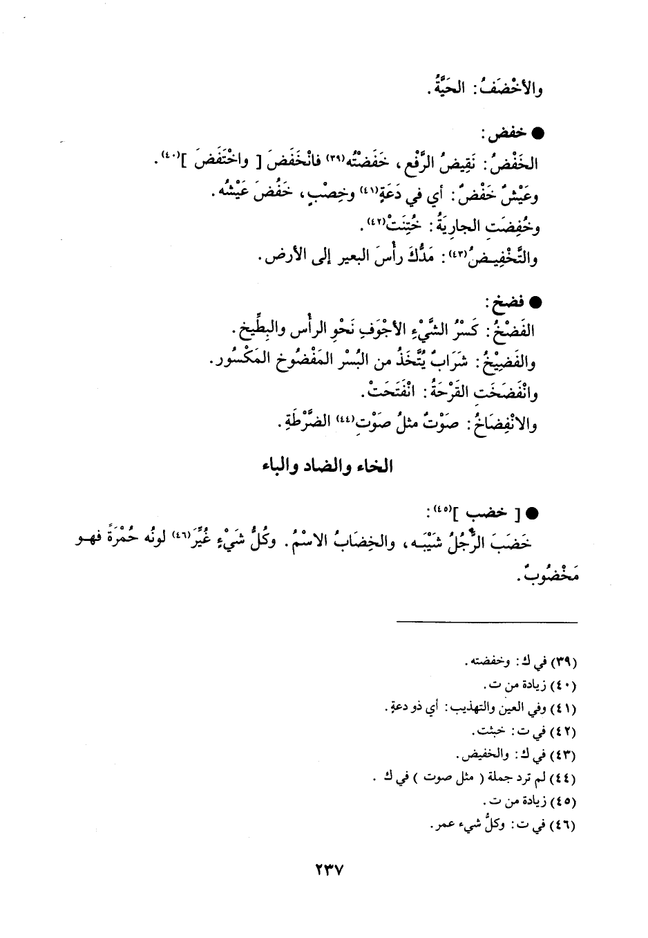 والأخضف الحية . خفض الخفض نقيض الرفع ، خفضته فانخفض واختفض . وعيش خفض أي في دعة وخصب ، خفض عيشه . وخفضت الجارية ختنت . والتخفيض مدك رأس البعير إلى الأرض . ؟ فضخ الفضخ كسر الشيء الأجوف نحو الرأس والبطيخ . والفضيخ شراب يتخذ من البسر المفضوخ المكسور . وانفضخت القرحة انفتحت . والانفضاخ صوت مثل صوت الضرطة .