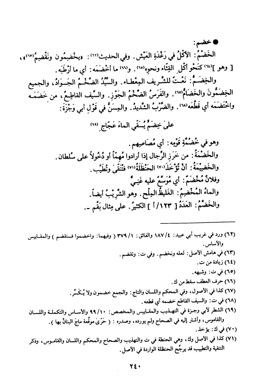 خضم الخضم الأكل في رغدة العيش . وفي الحديث ' يخضمون ونقضم ' ، وهو كنحو أكل القثاء ونحوه . وما أخضمه أي ما أرطبه . والخضم نعت للشريف المعطاء . والسيد الضخم الجواد ، والجميع الخضمون والخضام . والفرس الضخم الجوز . والسيف القاطع ، من خضمه واختضمه أي قطعه . والضرب الشديد . والمسن في قول أبي وجزة على خضم يسقي الماء عجاج وهو في خضمة قومه : أي مصاصهم . والخضمة : من خرز الرجال إذ أرادوا مهماً أو دخولاً على سلطان . والخضيمة : أن تؤخذ الحنظلة فتنقى وتطيب . وفلان مخضم : أي موسع عليه غني . والماء المخضم : الغليظ الملح . وهو الشريب أيضاً . والخضم : العدد 123 أ الكثير . على مثال بقم .