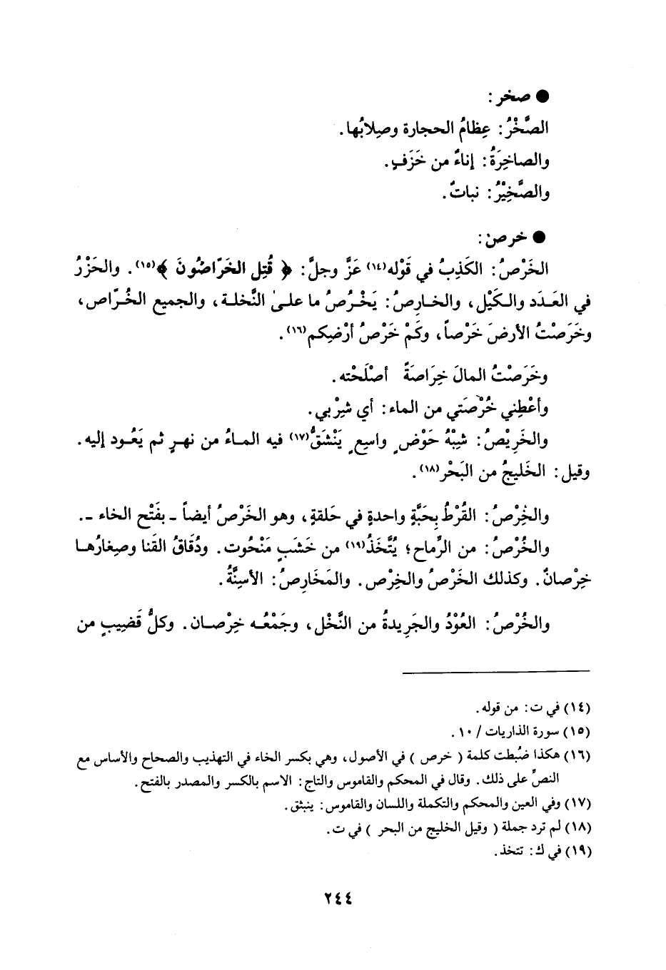 صخر الصخر عظام الحجارة وصلابها . والصاخرة إناء من خزف . والصخير نبات . خرص الخرص الكذب في قوله عز وجل ' قتل الخراصون ' . والحزر في العدد والكيل ، والخارص يخرص ما على النخلة ، والجميع الخراص ، وخرصت الأرض خرصاً ، وكم خرص أرضكم . وخرصت المال خراصة أصلحته . وأعطني خرصتي من الماء أي شربي . والخريص شبه حوض ولسع ينشق فيه الماء من نهر ثم يعود إليه . وقيل الخليج من البحر . والخرص القرط بحبة واحدة في حلقةٍ ، وهو الخرص أيضاً - بفتح الخاء - . والخرص من الرماح ؛ يتخذ من خشب منحوت . ودقاق القنا وصغارها خرصان . وكذلك الخرص والخرص . والمخارص الأسنة . والخرص العود والجريد من النخل ، وجمعه خِرْصان . وكل قضيب من