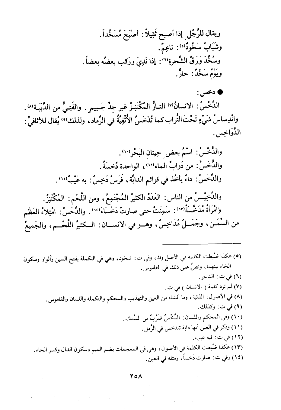 ويقال للرجل إذا أصبح ثقيلاً أصبح مسخداً . وشباب سخود ناعم . وسخد ورق الشجر إذا ندي وركب بعضه بعضاً . ويوم سخد حار . دخس الدخس الإنسان التار المكتنز غير جد جسيم . والفتي من الدببة . واندساس شيء تحت التراب كما تدخس الأثفية في الرماد . ولذلك يقال للأثافي الدواخس . والدخس اسم بعض حيتان البحر . والدخس من دواب الماء ، الواحدة دخسة . والدخس داء يأخذ في قوائم الدابة ، فرس دخس به عيب . والدخيس من الناس العدد الكثير المجتمع ومن اللحم المكتنز . وامرأة مدخسة سمنت حتى صارت دخساء . والدخس امتلاء العظم من السمن ، وجمل مداخس ، وهو في الإنسان الكثير اللحم ، والجميع