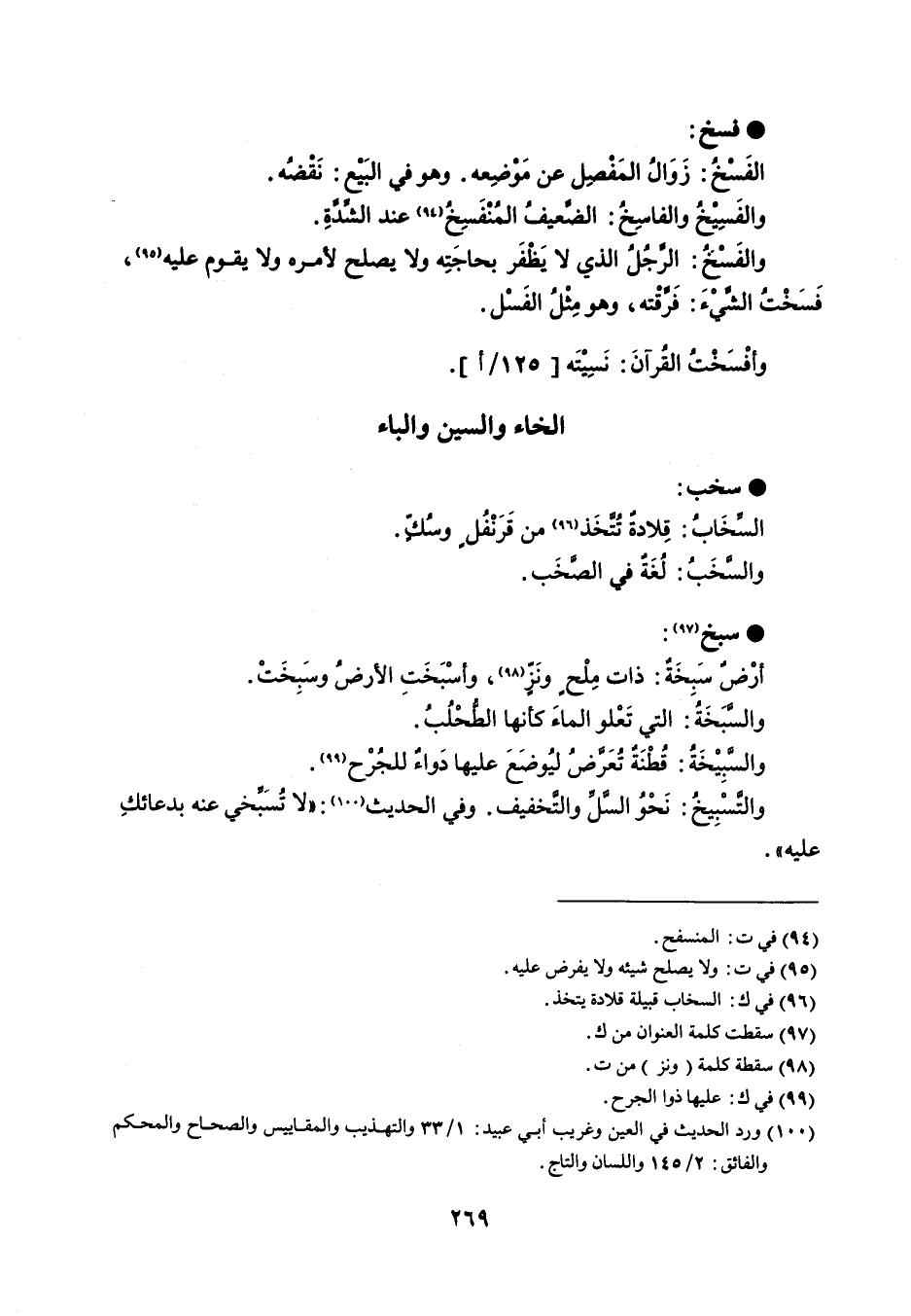سخب السخابة قلادة تتخذ من قرنفل وسك . والسخب لغة في الصخب . سبخ أرض سبخة ذات ملح ونز ، وأسخبت الأرض وسبخت . والسبخة التي تعلو الماء كأنها الطحلب . والسبيخة قطنة تعرض ليوضع عليها دواء للجرح . والتسبيخ نحو السل والتخفيف . وفي الحديث ' لا تسبخي عنه بدعائك عليه ' .