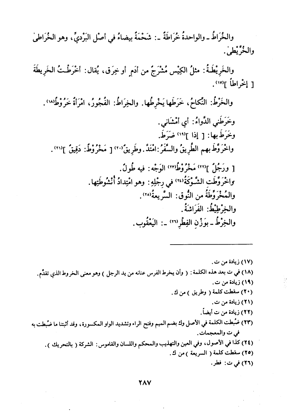 والخُرَاطُ - والواحدةُ خُرَاطَةٌ - : شَحْمَة بيضاءُ في أصْل البَرْديَ ، وهو الخُرَاطى والخُريْطى . والخَرِيْطَةُ : مثلُ الكِيْس مُشْرَجٌ من أدَم أو خِرَق ، يُقال : أخْرَطْتُ الخَرِيطَةَ إخراطاً . والخَرْطُ : النكاحُ ، خَرَطَها يَخْرِطُها . والخِرَاطُ : الفُجُورُ ، امْرَأةٌ خَرُوْطٌ . وخَرَطَني الدواءُ : أي أمْشَاني . وخَرَطَ بها : إذا ضَرَطَ . واخْرَوَّطَ بهم الطَرِيقُ والسَّفَرُ : امْتَدَّ . وطَرِيقٌ مَخْرُوْط : دَقِيقٌ . ورَجُل مَخْرُوْط الوَجْه : فيه طُول . واخْرَوطَتِ الشوْكَةُ في رِجْلِهِ : وهو امْتِدادُ أنْشُوطَتِها . والمُخْرَوَطَةُ من النوق : السًريعةُ . والخِرْطِيْطُ : الفَرَاشَة . والخِرْطُ - بوَزْنِ الفِطْرِ - : اليَعْقُوب .