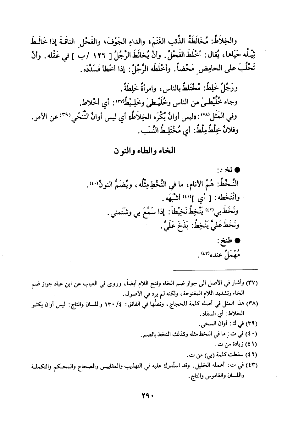 نخط النَخْطُ : هُمُ الأنام ، ما في النَخْطِ مِثْلُه ، ويُضَمُ النونُ وانْتَخَطه : أي أشْبَهَه . ونَخَطَ بي يَنْخِطُ نَخِيْطاً : إذا سَمَّعَ بي وشَتَمني . ونَخَطَ عَليَّ يَنْخِطُ : بَذَخَ عَلَيَ . طنخ مُهْمَلٌ عنده .