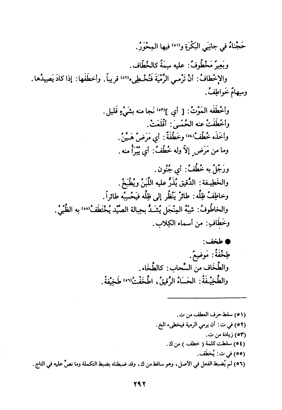 حَجْناءُ في جانِبَي البَكْرَة وفيها المِحْوَرُ . وبَعِيرٌ مَخْطُوفٌ : عليه سِمَةٌ كالخُطّاف . والإِخْطافُ : أنْ تَرْمي الرَّمْيَةَ فَتُخْطِئ قريباً . وأخطَفَها : إذا كادَ يَصيدها . وسِهامٌ خَواطِفُ . وأخْطَفَه المَوْتُ : أي نَجا منه بشَيْءٍ قَليل . وأخْطَفَتْ عنه الحُمّى : أقْلَعَتْ . وأخَذه خُطْف وخَطْفَةٌ : أي مَرَضٌ هَين . وما من مَرَض إلاّ وله خُطْف : أي يُبْرأ منه . ورَجُلٌ به خُطُف : أي جُنُون . والخَطِيفة : الدقيق يُذَر عليه اللَبَنُ ويُطْبَخُ . وخاطِفُ ظِلَه : طائرٌ يَنْظُر إلى ظِلًه فيَحْسِبُه طائراً . والخاطُوفُ : شِبْهُ المِنْجَل يُشَد بحِبالة الصَّيْد يُخْتَطَفُ به الظَّبْيُ . وخَطَافِ : من أسماء الكِلاب . طخف طِخْفَةُ : مَوضِعٌ . والطخَاف من السحاب : كالطخَاء . والطخِيْفَةُ : الحَسَاءُ الرقيقُ ، اطخَفْتُ طَخِيْفةً .